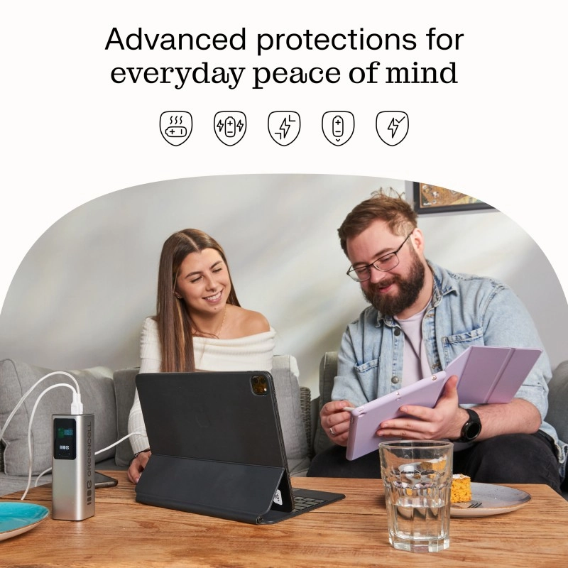 Integrovaný LCD displej poskytne kľúčové údaje v reálnom čase: stav nabitia, aktuálny výkon, počet cyklov, teplotu aj reálnu kapacitu. Funkcia pass‑through umožní nabíjať powerbanku a zariadenia zároveň – šetrí čas a zvyšuje komfort. Powerbanka spĺňa medzinárodné letecké normy, takže si ju môžete vziať aj do lietadla.