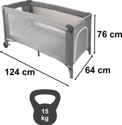 Táto cestovná postieľka je ideálna na dovolenky, návštevy aj každodenné použitie doma. Odolná konštrukcia so stabilným krížovým rámom do tvaru X a dvoma kolieskami s brzdou umožňuje ľahké presúvanie, zatiaľ čo protišmykové nožičky zaisťujú istotu na akomkoľvek povrchu. Sieťované boky zabezpečujú výborné vetranie a stály dohľad nad dieťaťom.