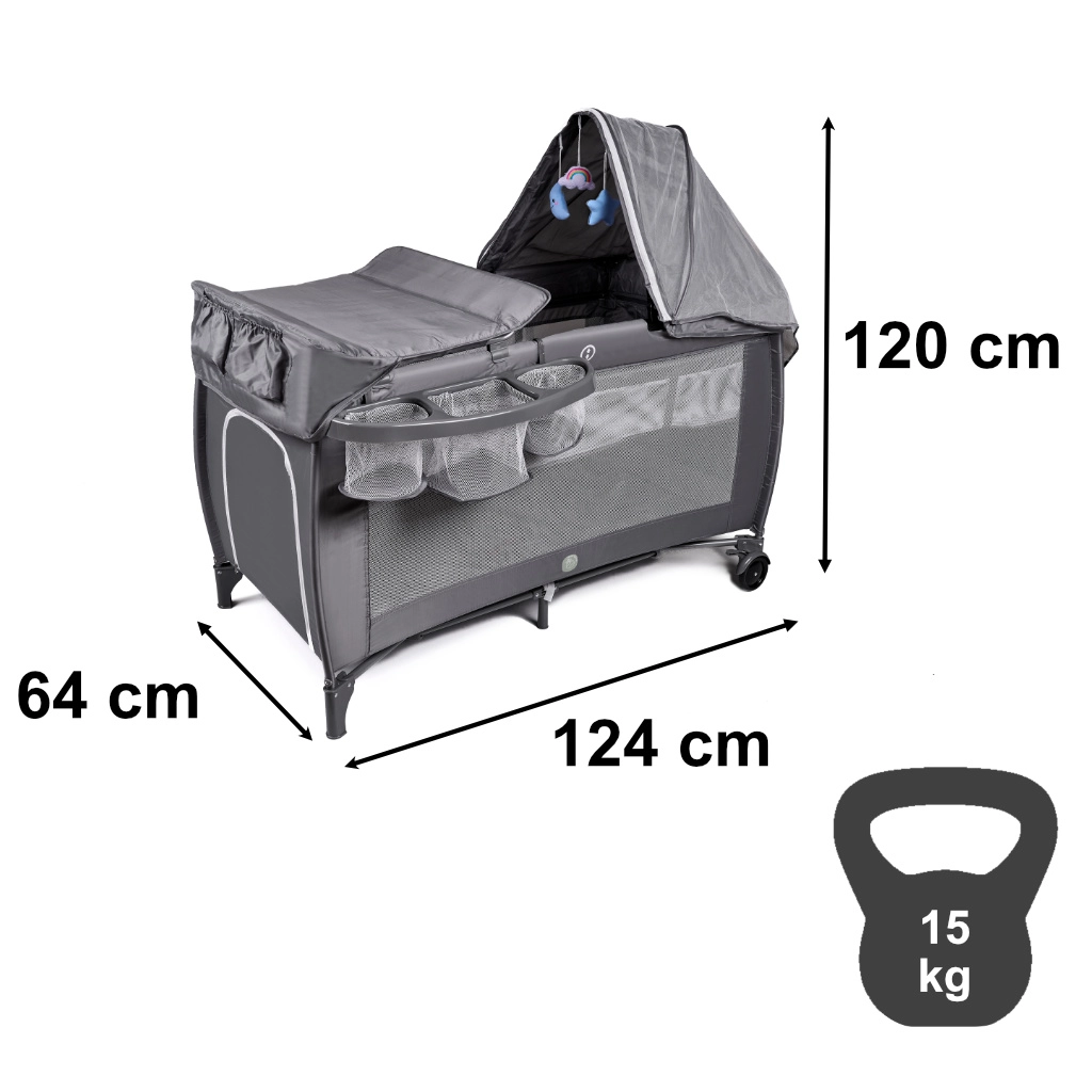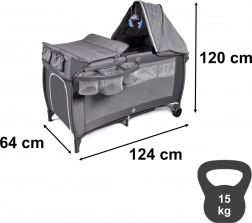 Praktická cestovná postieľka pre bábätká a batoľatá s dvojúrovňovou posteľou, prebaľovacím pultom a sieťkou proti hmyzu s hračkami. Vďaka rýchlemu skladaniu, kolieskam s brzdou a vzdušným sieťovaným bočniciam zaistí pohodlný spánok aj jednoduchú starostlivosť doma i na cestách. Organizéry a vrecká udržia všetky potreby pekne po ruke.