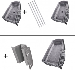 - postieľka, druhá úroveň, matrac so suchými zipsami, strieška so sieťkou proti hmyzu a 3 hračkami, 4 montážne tyče, prebaľovací pult, organizér, taška, návod
