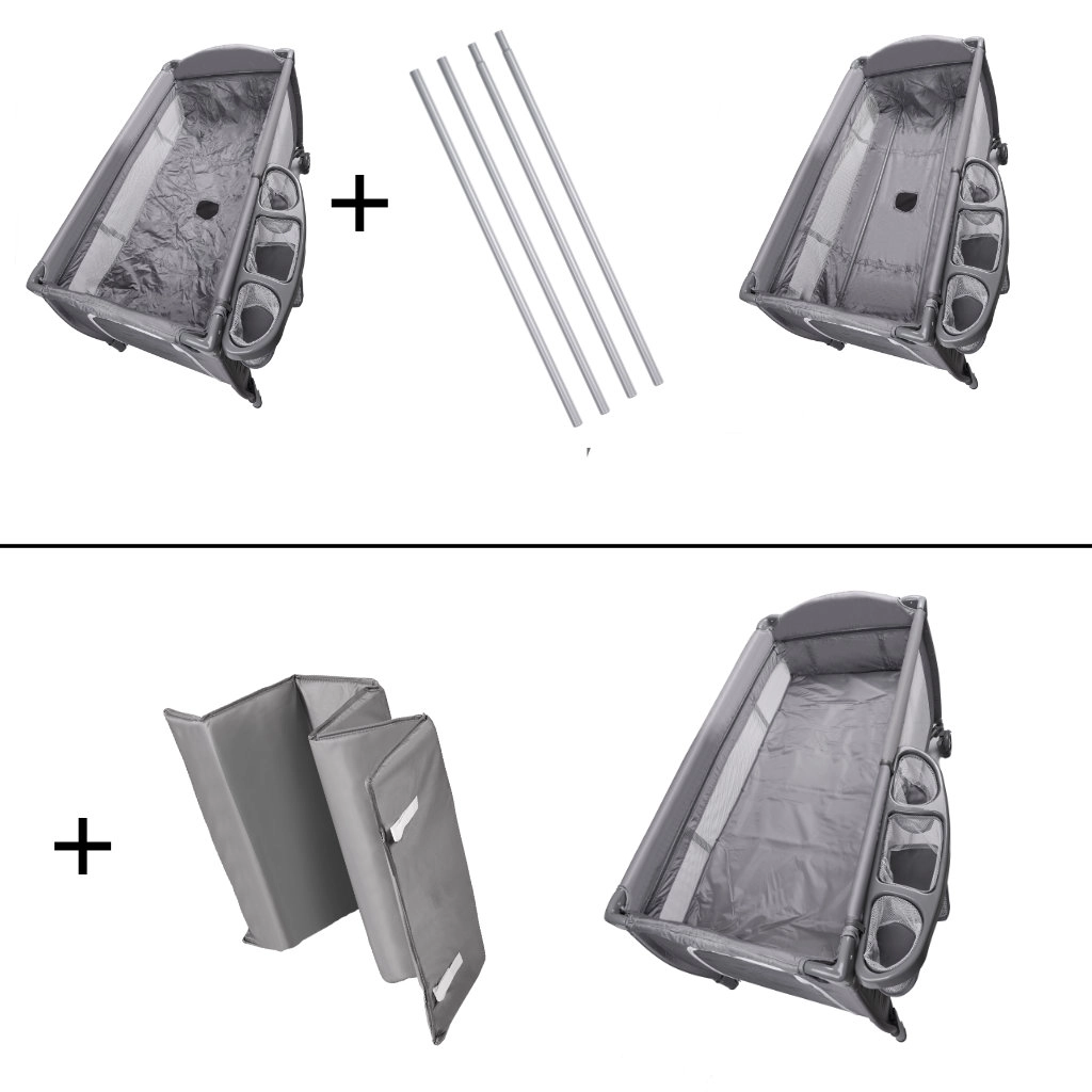 Pre rodičov je tu prebaľovací nadstavec a praktické organizéry na plienky a drobnosti, takže máte všetko vždy po ruke. Rýchly skladací mechanizmus, kolieska s aretáciou a transportná taška uľahčia prenášanie aj skladovanie – ideálne na dovolenku, k starým rodičom aj do malých bytov.