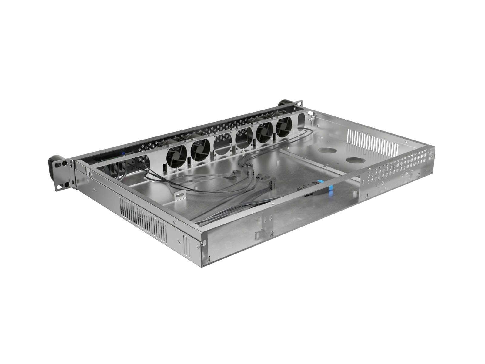O chladenie sa starajú 4× 40 mm PWM ventilátory (cca 4000–8000 ot./min), ktoré kombinujú nízku hlučnosť a dlhú životnosť, takže systém zostáva stabilný aj v nepretržitej prevádzke. Skriňa je vyrobená z galvanizovanej ocele 1,0 mm pre vyššiu odolnosť voči vibráciám a mechanickému namáhaniu, čo chráni komponenty pri montáži v racku aj transporte.