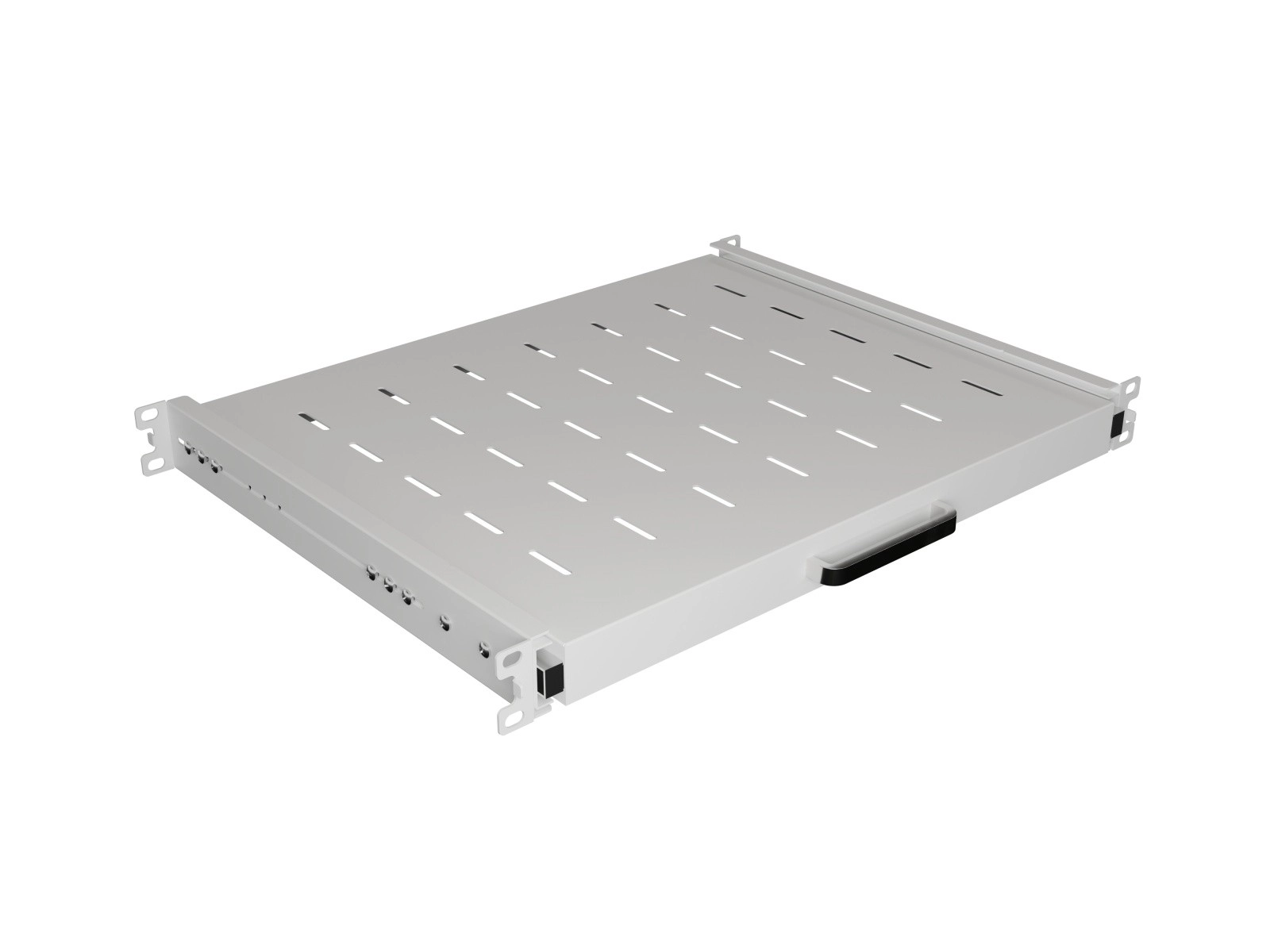 Teleskopické lišty a predné madlo umožňujú plynulé vysunutie police pre jednoduchú obsluhu a servis zariadení v racku.