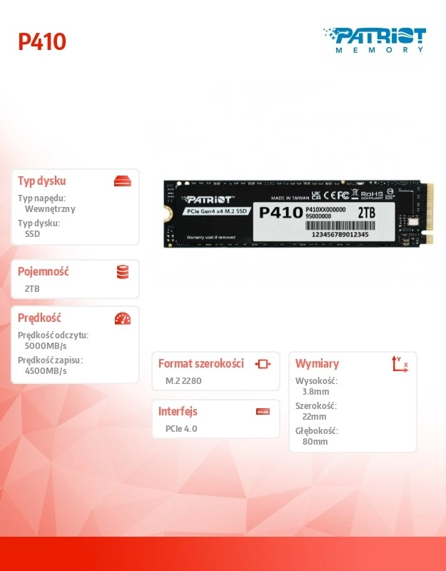 Zrýchlite svoj počítač s SSD PATRIOT P410 s kapacitou 2 TB. Ponúka rýchlosti čítania až 5000 MB/s a zápisu až 4500 MB/s, úspornú prevádzku pre dlhšiu výdrž batérie a kompaktný formát M.2 2280 pre jednoduchú inštaláciu. Vďaka grafénovému tepelnému rozhraniu a tepelnej ochrane udržiava stabilný výkon aj pri záťaži – ideálne pre hráčov, tvorcov aj profesionálov.