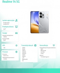 Štýlový smartfón Realme 14 5G v farbe Mecha Silver prináša špičkový 6,67" AMOLED displej so 120 Hz a jasom až 2000 nitov, výkonný čip Snapdragon 6 Gen 4, veľkú batériu 6000 mAh a fotografickú zostavu s 50 Mpx hlavným fotoaparátom s OIS. Nechýba 5G, Wi‑Fi 6, Bluetooth 5.2, Dual SIM ani Android 15 s Realme UI 6.0.