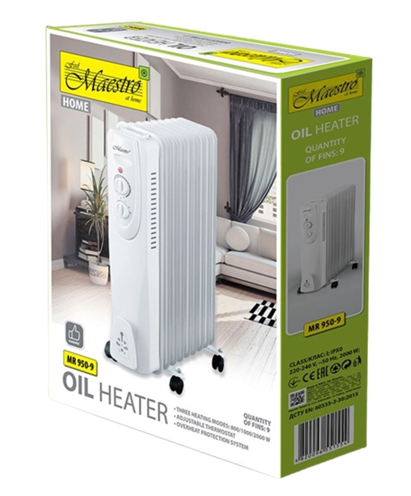Kompaktný a výkonný olejový radiátor Maestro MR-950-9 poskytne rýchle a rovnomerné teplo v domácnosti aj kancelárii. Vďaka 3 stupňom výkonu (800/1200/2000 W), 9 vykurovacím rebrám a nastaviteľnému termostatu ľahko dosiahnete ideálnu teplotu. Kontrolky prevádzky a kolieska na jednoduché presúvanie zaisťujú pohodlné a bezpečné používanie.