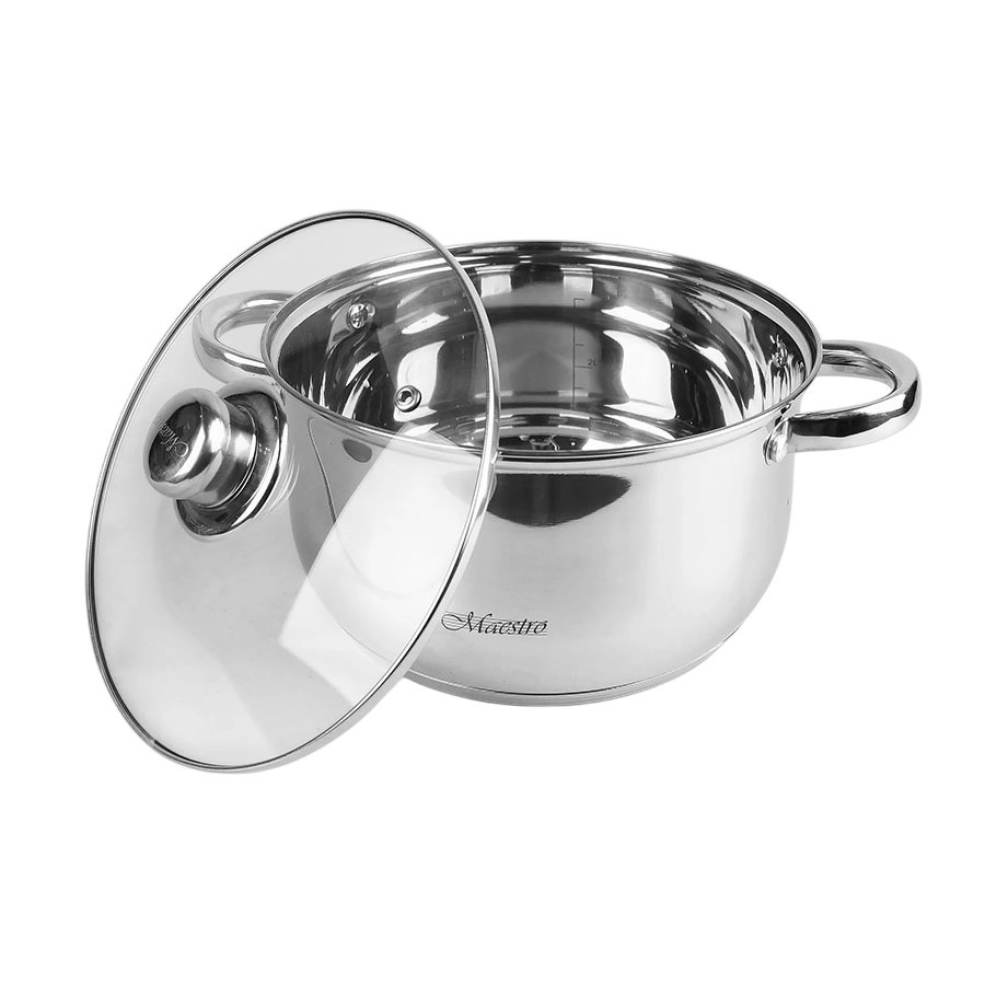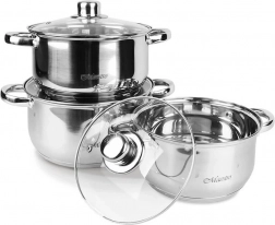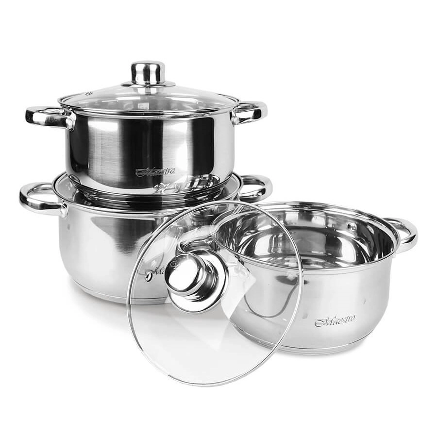 So 6-dielnou sadou hrncov Maestro získate spoľahlivé riady na každodenné použitie. Hrnce z odolnej nehrdzavejúcej ocele sa ľahko udržiavajú, sklenené pokrievky s otvorom na únik pary umožňujú kontrolu varenia a viacvrstvové termoakumulačné dno šetrí energiu vďaka rovnomernému rozvodu tepla.