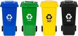 - Modrá – papier; Zelená – sklo; Žltá – plast/kov; Čierna – zmesový odpad