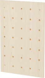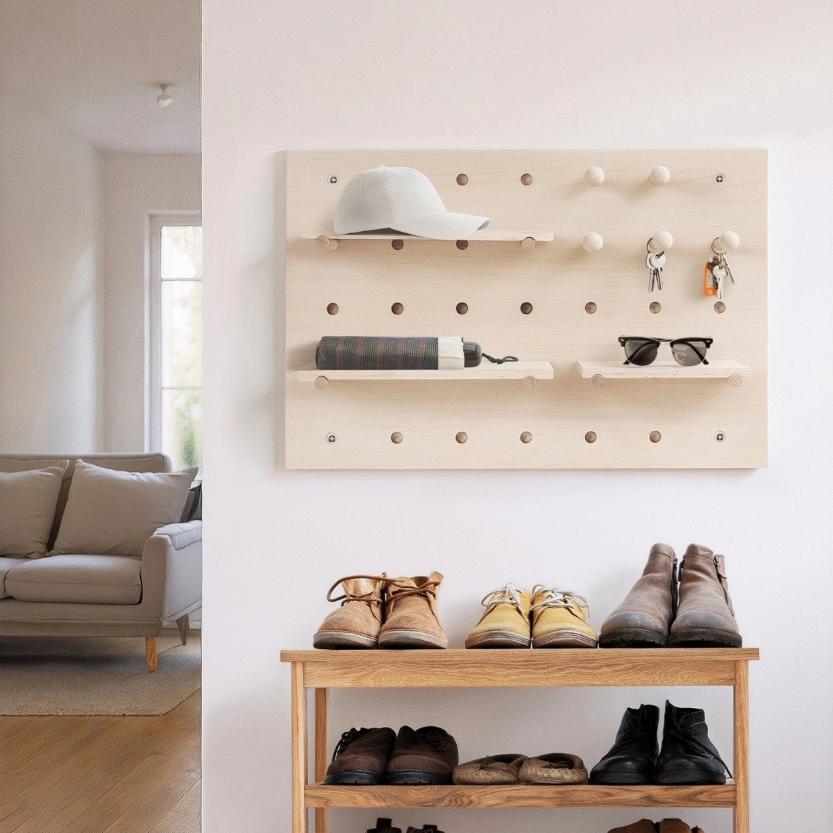 Nástenný pegboard organizér MACLEAN v povrchovej úprave svetlé drevo premení voľnú stenu na prehľadný a elegantný úložný priestor. Doska s pravidelnou mriežkou otvorov umožňuje slobodné rozmiestnenie kolíkov, háčikov a políc, takže ľahko vytvoríte miesto pre kľúče, okuliare, slúchadlá, kancelárske potreby, dekorácie alebo drobné náradie.