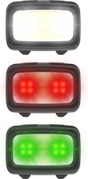 - 7 režimov: biela LED (silná/jasná/tlmená/blikanie), červené svetlo (stále/blikanie) a zelené svetlo