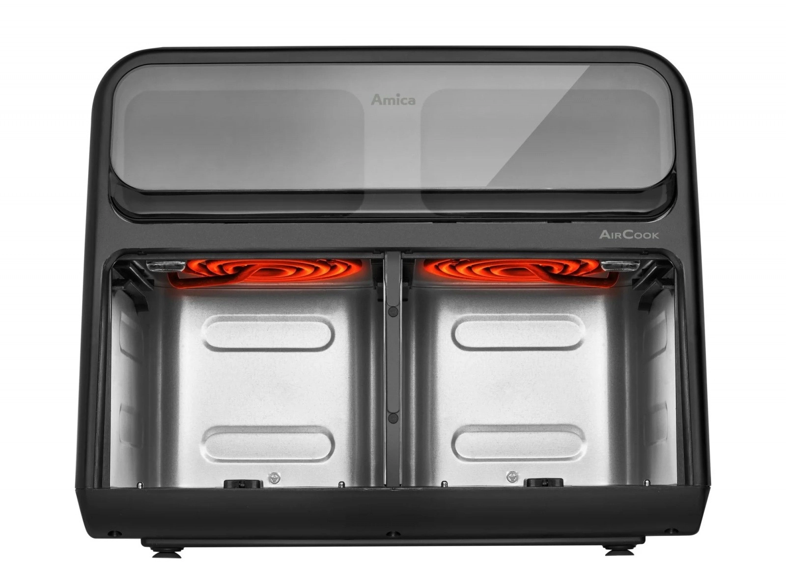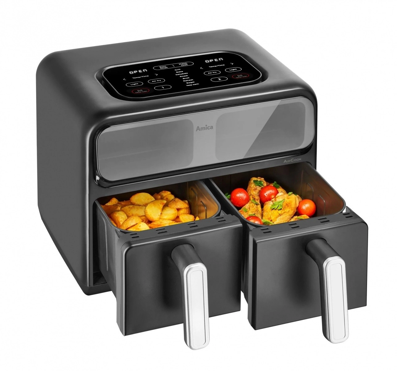 Objavte rýchlejší a zdravší spôsob varenia. Dvojkomorová teplovzdušná fritéza pripraví vaše obľúbené pokrmy s minimom tuku vďaka intenzívnej cirkulácii horúceho vzduchu. Dve nezávislé zóny umožnia piecť a smažiť rôzne suroviny súčasne a vďaka okienkam máte priebeh prípravy vždy pod kontrolou bez zbytočného otvárania zásuviek.