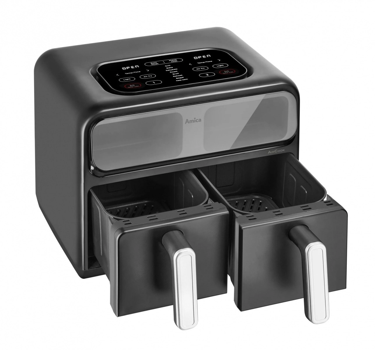 Intuitívne dotykové ovládanie s prehľadným LED displejom prináša predvolené programy pre AirFry, Roast, Toast, Broil, Bake, Dehydrate a Reheat. Funkcia Synchronizácia zladí dokončenie rôznych jedál v rovnakom čase a režim Dvojitá kapacita skopíruje nastavenie z prvej do druhej komory. Nechýba ani Frozen Food pre rýchle rozmrazovanie.