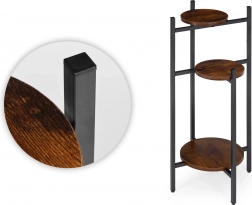 Konštrukcia z práškom lakovanej ocele zaručuje odolnosť voči korózii a mechanickému opotrebovaniu, zatiaľ čo okrúhle police z drevotriesky v dekore dreva dodajú teplo a charakter. Protišmykové nožičky chránia podlahu a zvyšujú stabilitu, takže sa stojan hodí aj do frekventovaných miest.