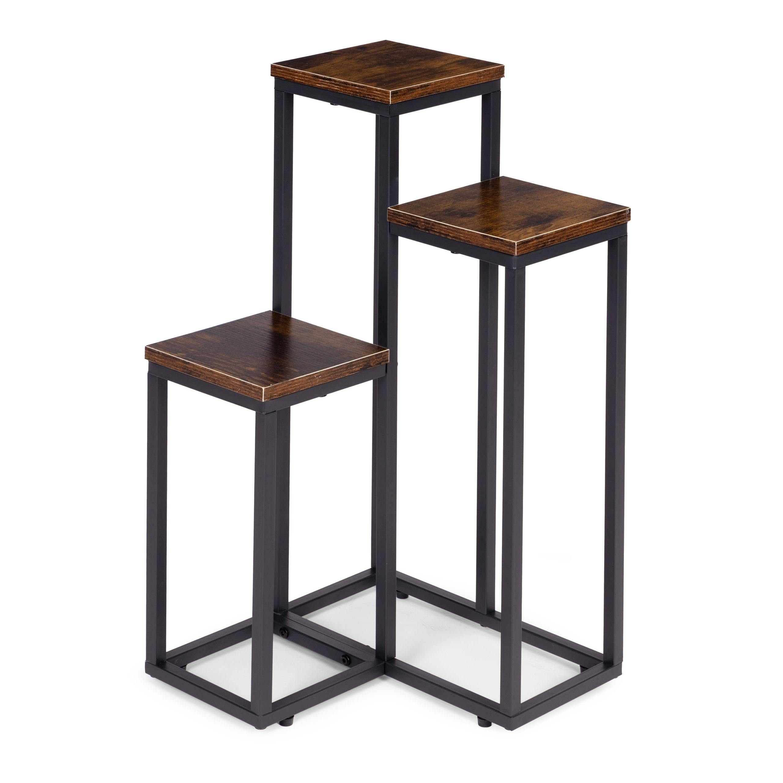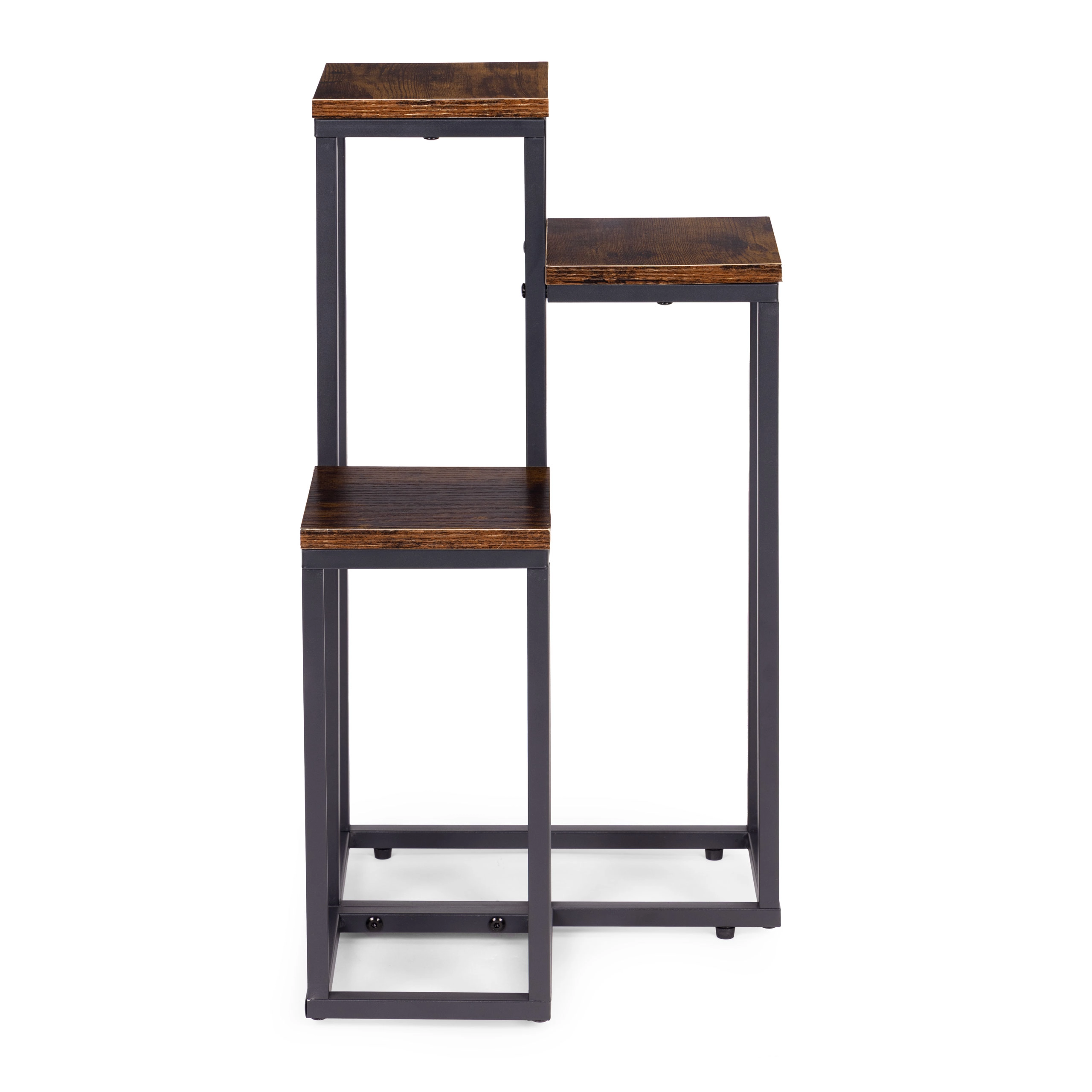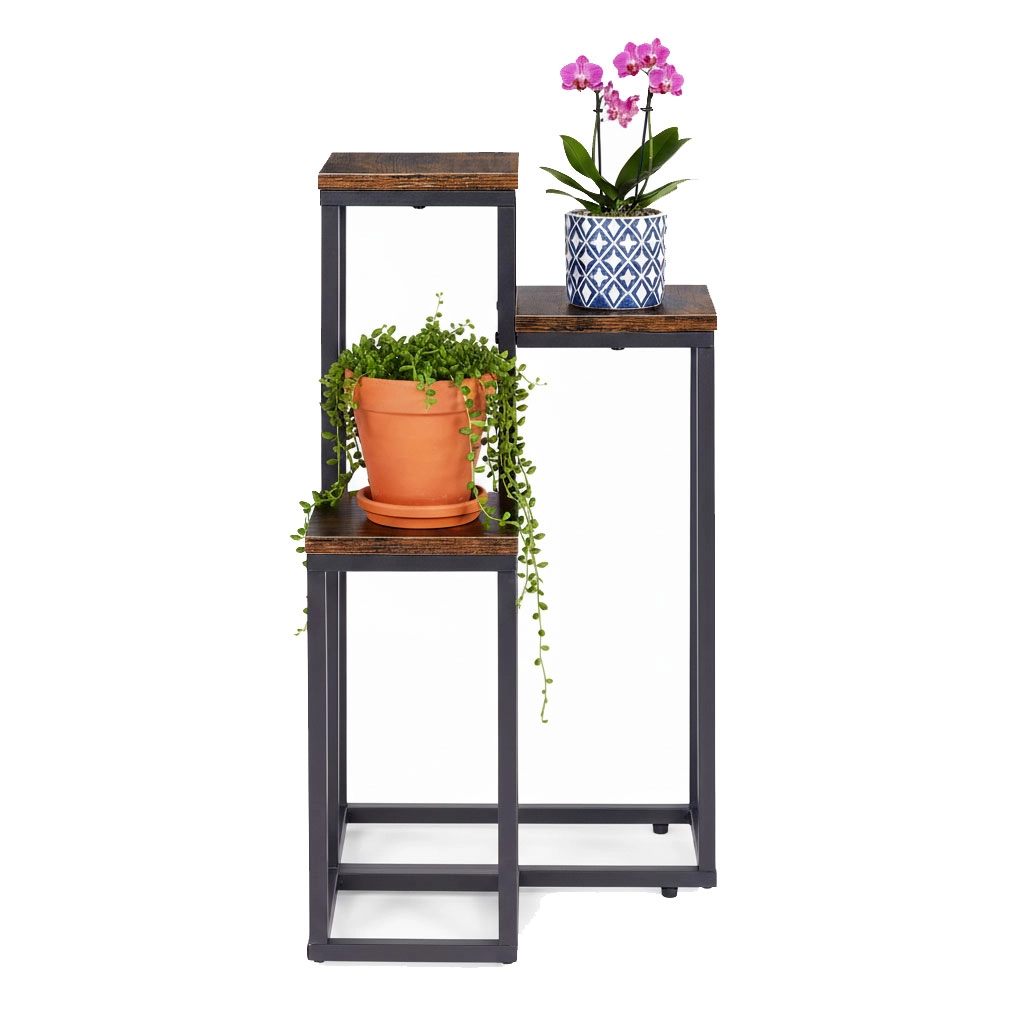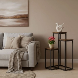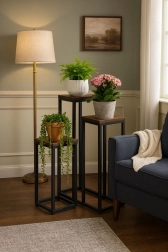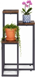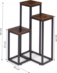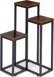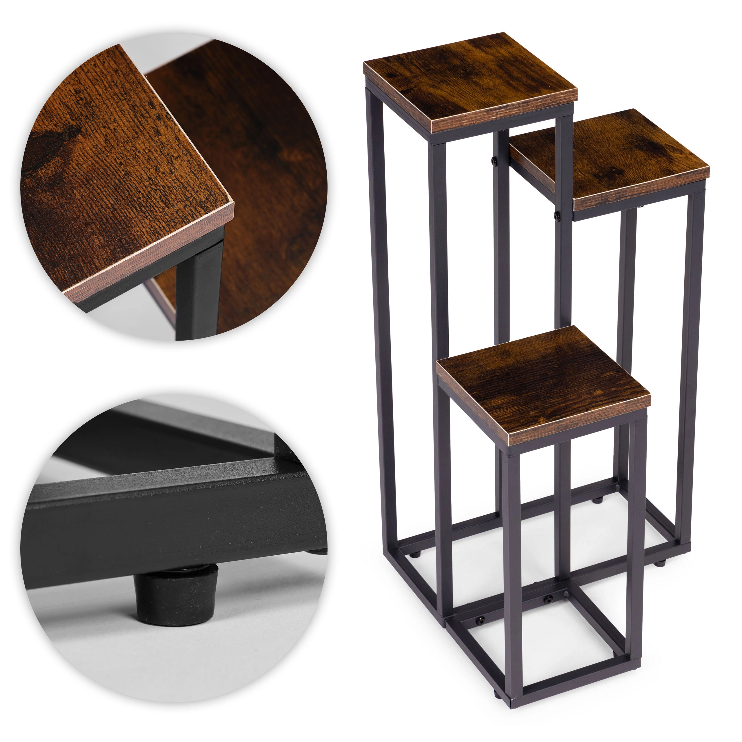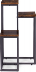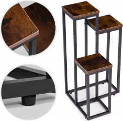 Rám z práškovou farbou lakovanej ocele odoláva korózii a mechanickému opotrebeniu, zatiaľ čo dosky v dekore prírodného dreva podčiarkujú moderný loftový charakter. Protišmykové nožičky zvyšujú stabilitu a chránia podlahu pred poškrabaním. Maximálna nosnosť 5 kg je ideálna pre väčšinu kvetináčov a dekorácií.