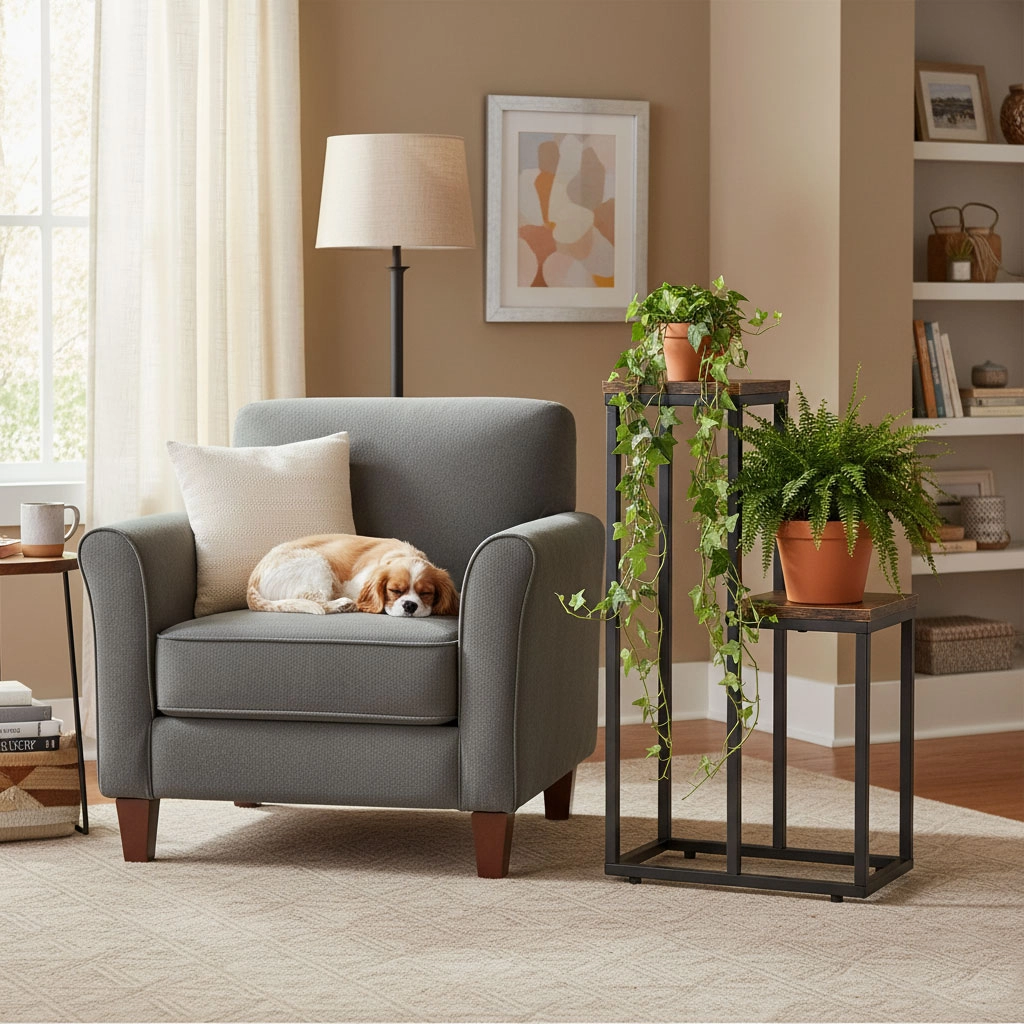 Elegantný stojan na kvety v industriálnom loft štýle od ModernHome skvele doplní obývačku, kanceláriu aj komerčné priestory. Ponúka 2 praktické police z drevotriesky, stabilnú oceľovú konštrukciu s práškovým lakom a protišmykové nožičky na ochranu podlahy. Vďaka kompaktným rozmerom vytvoríte pôsobivú expozíciu rastlín aj v menších interiéroch.