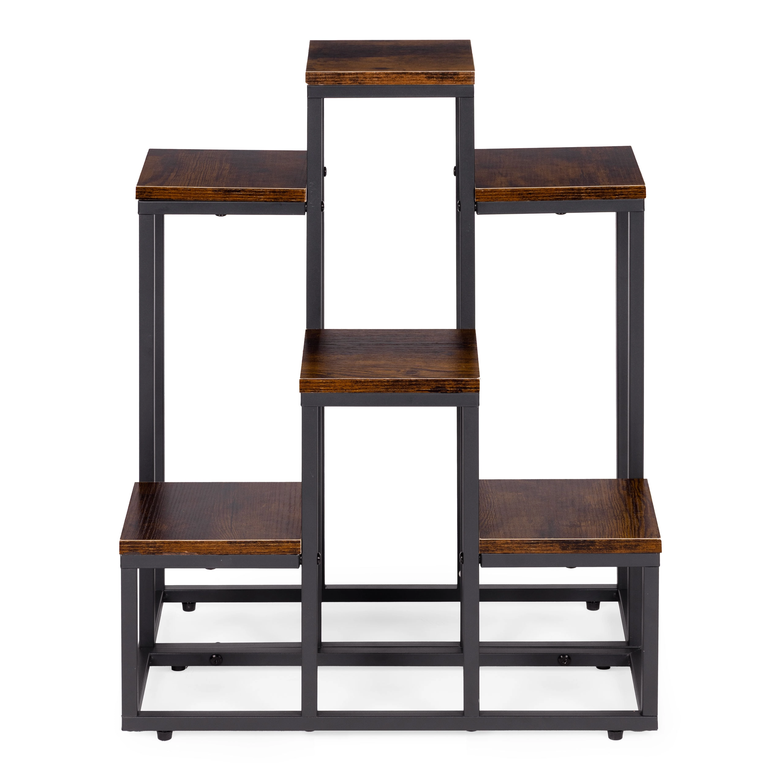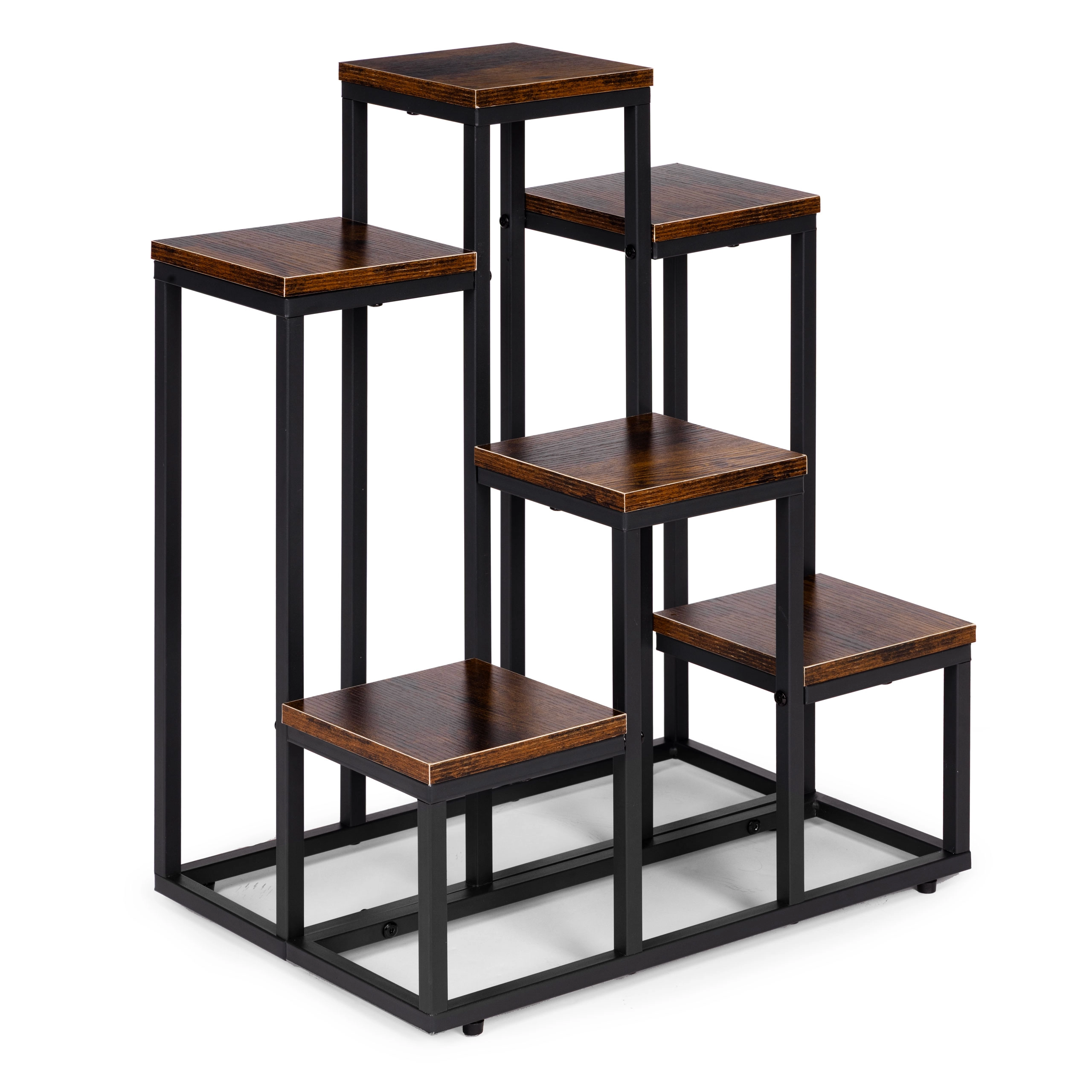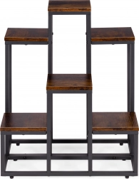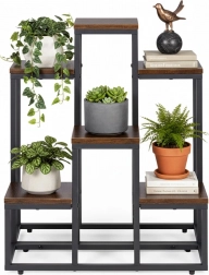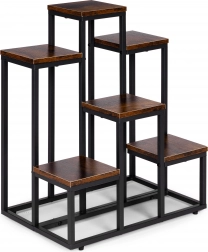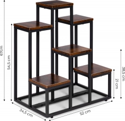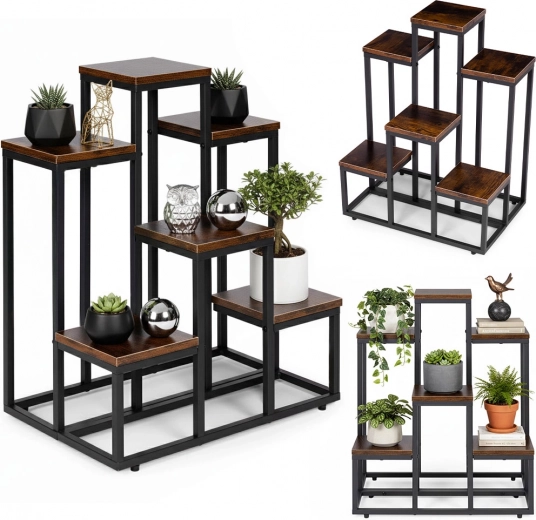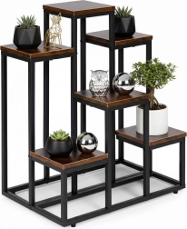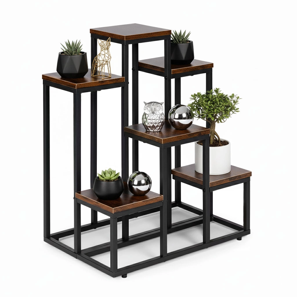Tento viacúrovňový stojan na kvety kombinuje moderný industriálny dizajn s praktickosťou. Šesť štvorcových políc v dekore dreva vytvára atraktívnu kompozíciu pre bylinky, sukulenty aj previsnuté rastliny, zatiaľ čo čierny oceľový rám zabezpečuje stabilitu a dlhú životnosť. Vďaka kompaktným rozmerom ľahko využijete vertikálny priestor pri stene či v rohu miestnosti.