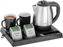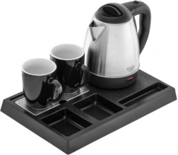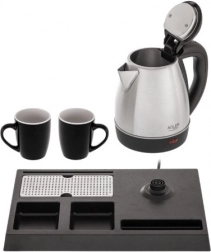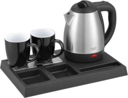 Elegantná a praktická sada pre hotely, penzióny a apartmány ponúka nehrdzavejúcu kanvicu 1,2 l, štýlový vodeodolný táck a 2 keramické hrnky 320 ml. Vďaka prehľadným priehradkám na čaj, kávu a doplnky, integrovanej zásuvke pre kanvicu a odkvapkávacej mriežke udržíte v izbe poriadok a hosťom doprajete pohodlný prístup k horúcim nápojom.