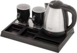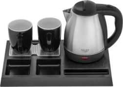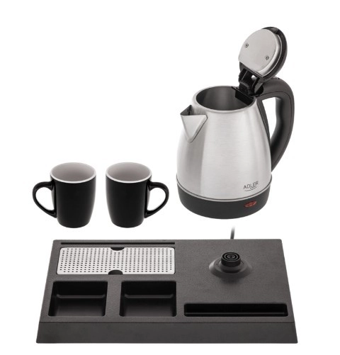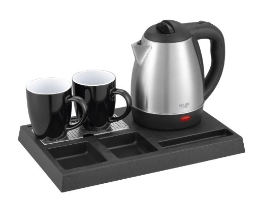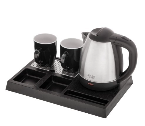 Sada ADLER AD 1354 je navrhnutá na profesionálne použitie v ubytovacích zariadeniach. Kombinuje estetiku a odolnosť: nehrdzavejúca kanvica zabezpečuje rýchlu prípravu horúcej vody, zatiaľ čo ABS táck so štruktúrovaným dekorom je vodeodolný a ľahko sa čistí. Dva keramické hrnky bez loga pôsobia univerzálne a elegantne.