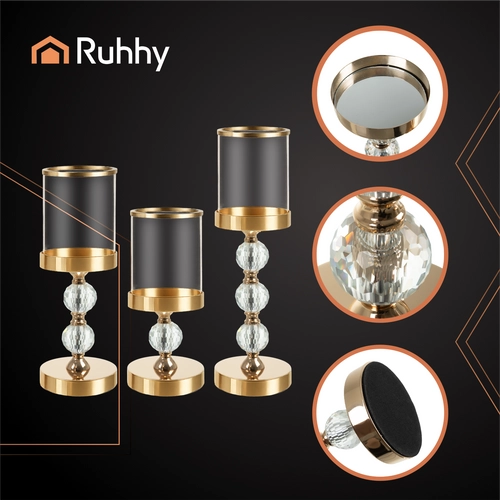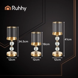 Elegantná sada troch svietnikov RUHHY rozžiari každý interiér. Kombinácia skla, zrkadlových vložiek a zlatých detailov vytvára luxusný glamour vzhľad, ktorý krásne odráža svetlo sviečok. Stabilná, bezpečná základňa chráni nábytok pred poškriabaním a jednoduchá údržba zaisťuje praktické používanie. Ideálne na komodu, stôl či krb aj ako štýlový darček.