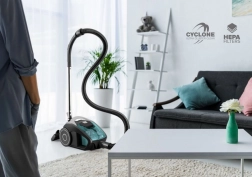 Vysávač je vybavený dvomi HEPA filtrami, ktoré zachytia až 99,9 % alergénov, prachu a roztočov. Jeden filter chráni motor, druhý čistí výstupný vzduch. Regulácia sania v rukoväti umožňuje prispôsobiť výkon povrchu – jemnejšie na záclony, silnejšie na koberce a tvrdé podlahy. Vďaka ergonomickej rukoväti, parkovacej polohe a jednoduchému vysýpaniu nádoby je obsluha maximálne pohodlná.