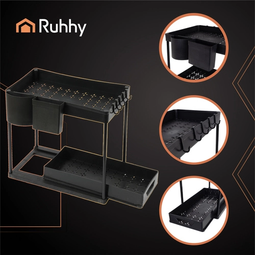 Urobte poriadok pod drezom aj v celej domácnosti s praktickým 2-úrovňovým organizérom Ruhhy. Vďaka výsuvným policiam, kompaktným rozmerom a odolnej konštrukcii z kovu a PP získate viac miesta a jednoduchý prístup ku všetkým potrebným veciam. Elegantné čierne prevedenie zapadne do každej kuchyne či kúpeľne a rýchla montáž bez náradia šetrí čas.