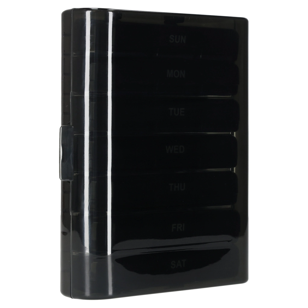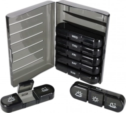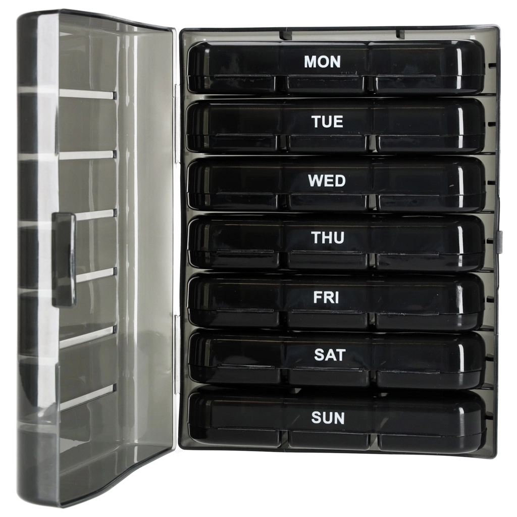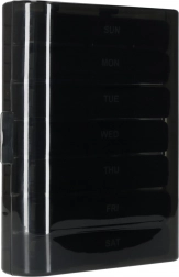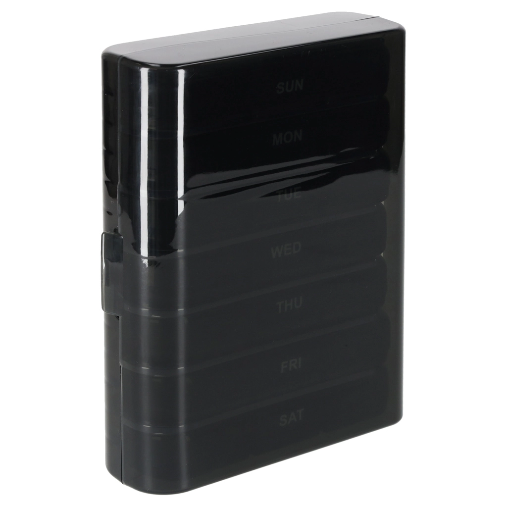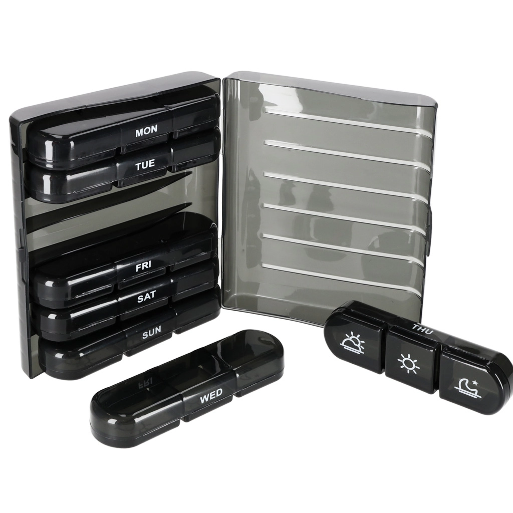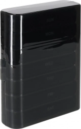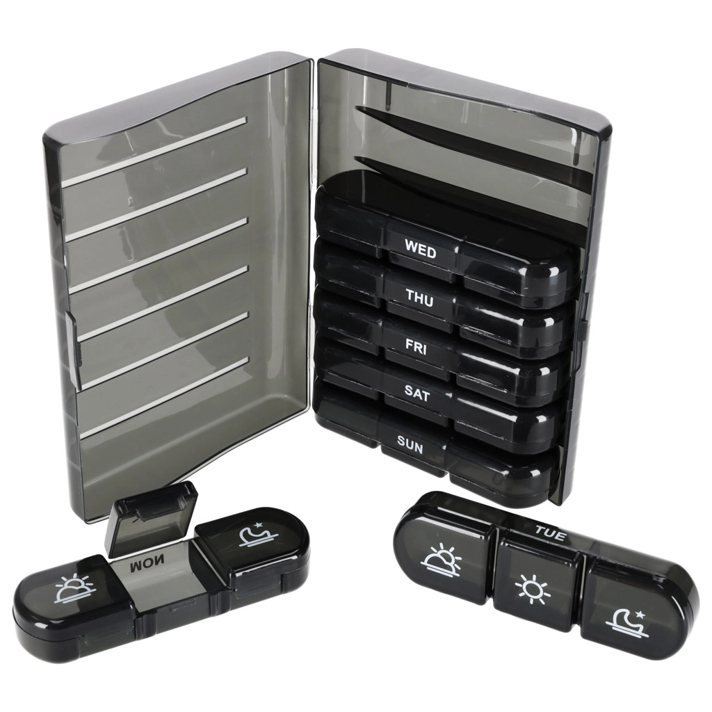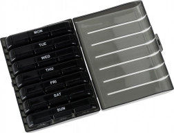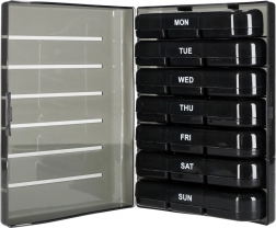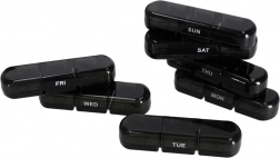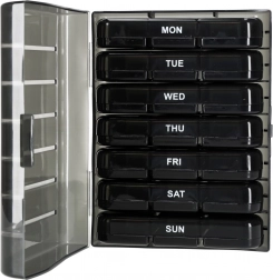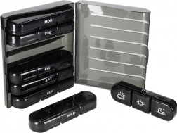 Moderný organizér na lieky pomôže s každodenným plánovaním užívania tabliet a doplnkov. Set tvorí 7 samostatných denných kaziet označených dňami v týždni (po anglicky) a ikonami denných dôb. Každá kazeta má uzatvárateľné priehradky, ktoré bránia vysypaniu aj prenikaniu vlhkosti.