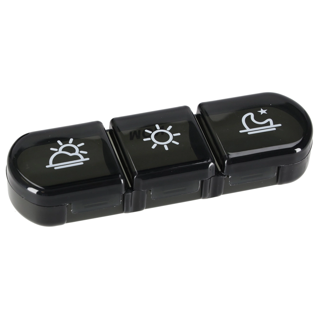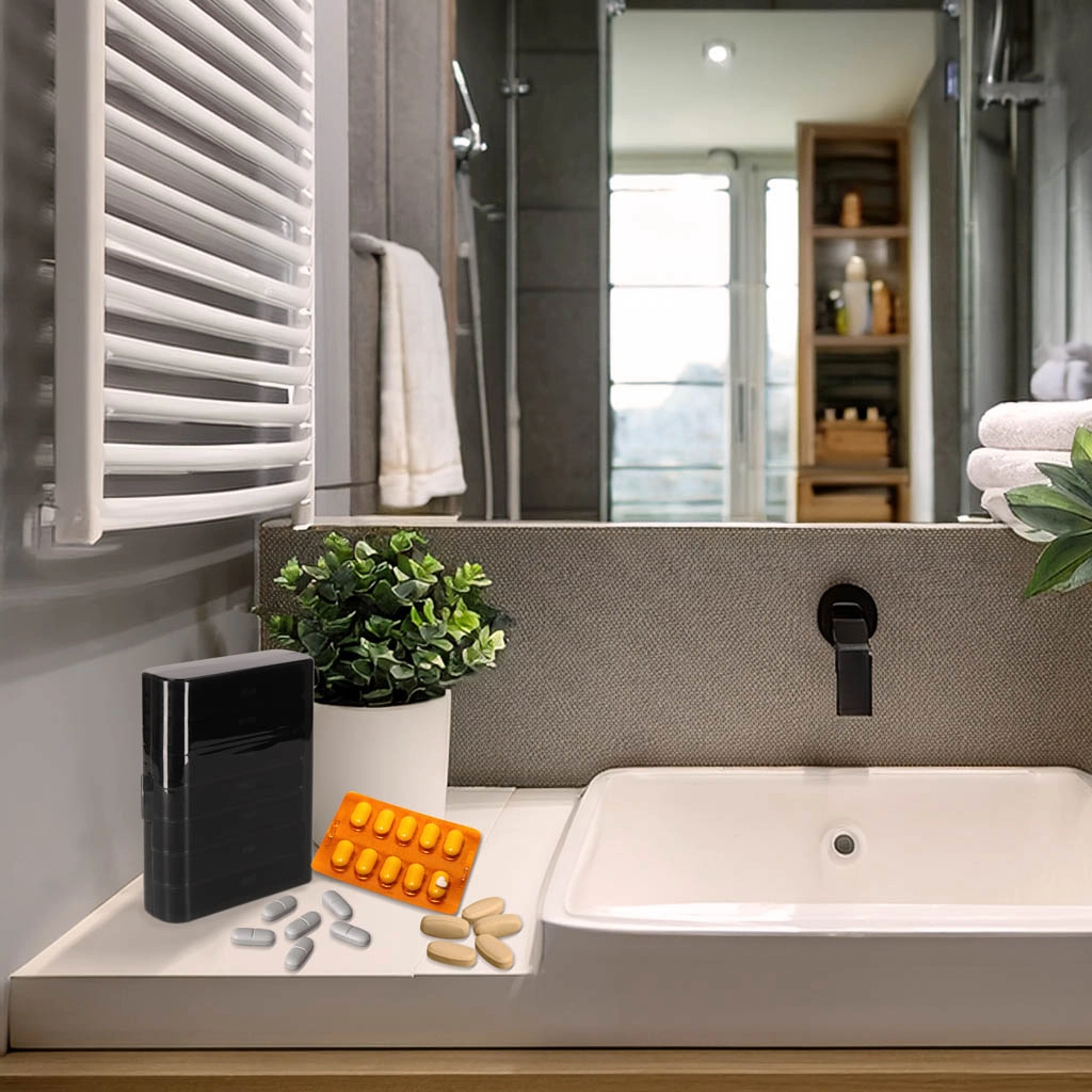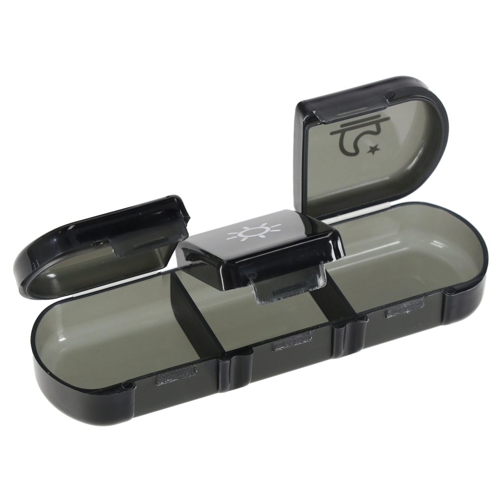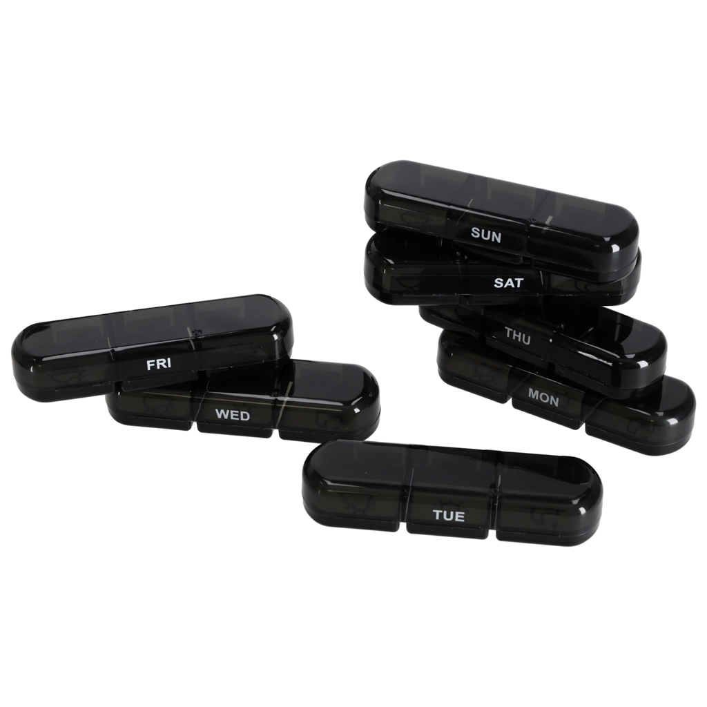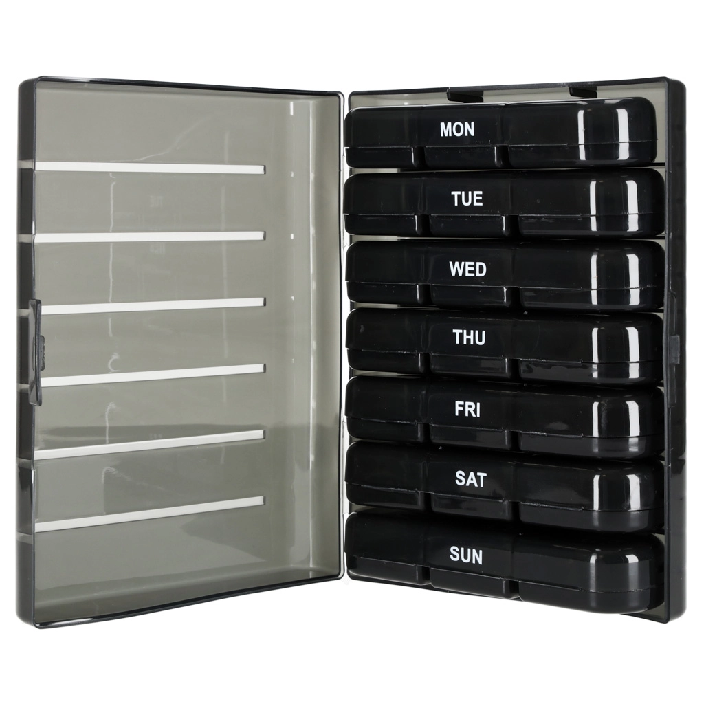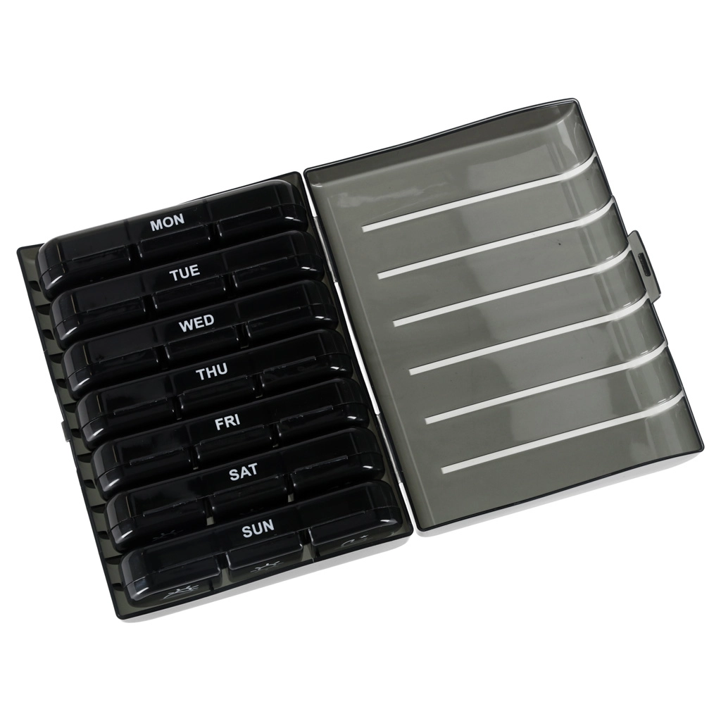 Moderný organizér na lieky pomôže s každodenným plánovaním užívania tabliet a doplnkov. Set tvorí 7 samostatných denných kaziet označených dňami v týždni (po anglicky) a ikonami denných dôb. Každá kazeta má uzatvárateľné priehradky, ktoré bránia vysypaniu aj prenikaniu vlhkosti.