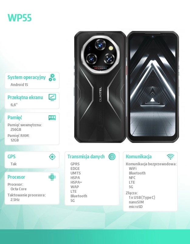 Nechýba 5G, Wi‑Fi, Bluetooth 5.2, NFC pre bezkontaktné platby a aktuálny systém Android 15. WP55 je skvelá voľba pre profesionálov v teréne, outdoor nadšencov aj každého, kto vyžaduje maximálnu spoľahlivosť.