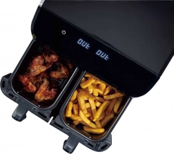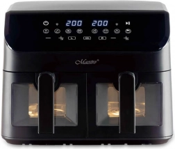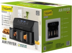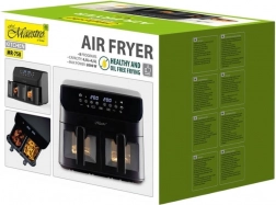MAESTRO MR-758 kombinuje rýchlu cirkuláciu horúceho vzduchu s priestrannými dvojitými košmi 2×4,5 l, takže súčasne pripravíte napríklad hranolčeky a kuracie mäso – každý v nezávislej zóne s vlastným nastavením času a teploty. Vďaka povrchu s nepriľnavou úpravou je čistenie jednoduché a každodenné používanie komfortné.