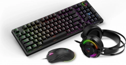 Vstúpte do hry s komplexnou sadou 3 v 1, ktorá kombinuje mechanickú RGB klávesnicu, RGB hernú myš so snímačom PixArt a RGB slúchadlá so samonastaviteľným mostom. Ideálne pre hráčov, ktorí chcú výkon, presnosť a štýlové podsvietenie v jednotnom dizajne.