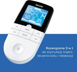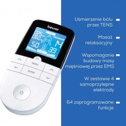Multifunkčný elektrostimulátor BEURER EM 49 spája TENS na úľavu od bolesti bez liekov, EMS na tréning a regeneráciu svalov a relaxačnú masáž. Ponúka 64 prednastavených programov a 6 používateľských režimov s možnosťou nastavenia frekvencie, šírky impulzu a času zapnutia/vypnutia. Vďaka 2 nezávislým kanálom, indikácii polohy elektród a funkcii Obľúbený program je ovládanie rýchle a intuitívne. Zdravotnícka pomôcka.