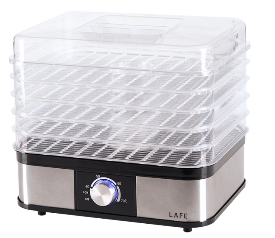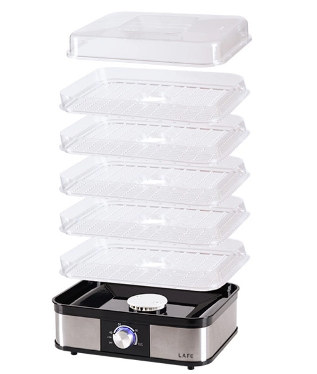 Transparentné poschodia uľahčujú kontrolu procesu, zatiaľ čo 5 objemných táckov dovolí sušiť väčšie množstvo surovín naraz. Ak potrebujete ušetriť miesto, niektoré tácky jednoducho odoberiete. Integrovaný ventilátor a perforované tácky podporujú cirkuláciu, bránia vzniku plesní a skracujú dobu sušenia.