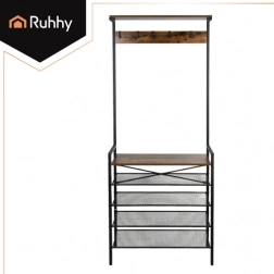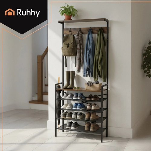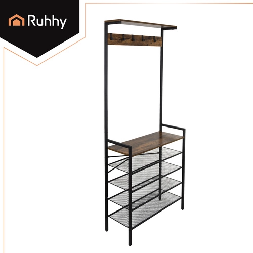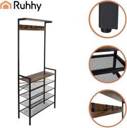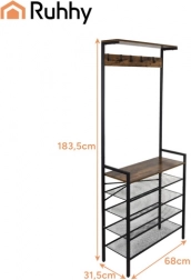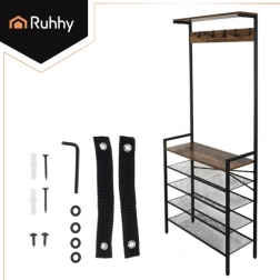 Usporiadajte si bundy, obuv a doplnky na jednom mieste. Predsieňový stojan RUHHY v industriálnom štýle spája odolnú kovovú konštrukciu s prírodným vzhľadom dreva. Vďaka sieťovaným policiam topánky lepšie vetrajú a rýchlejšie schnú, horná polica pojme čiapky či šály a háčiky udržia kabáty aj tašky vždy poruke.