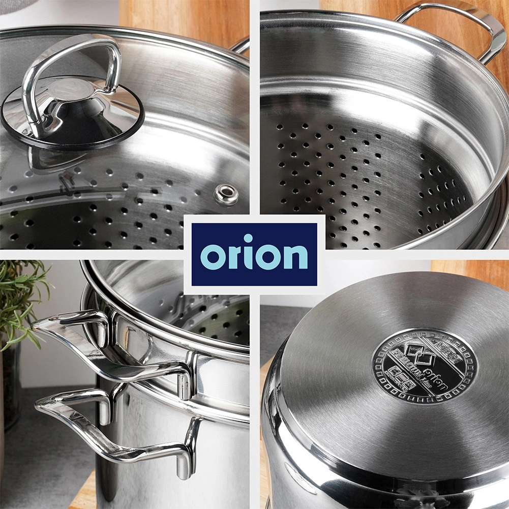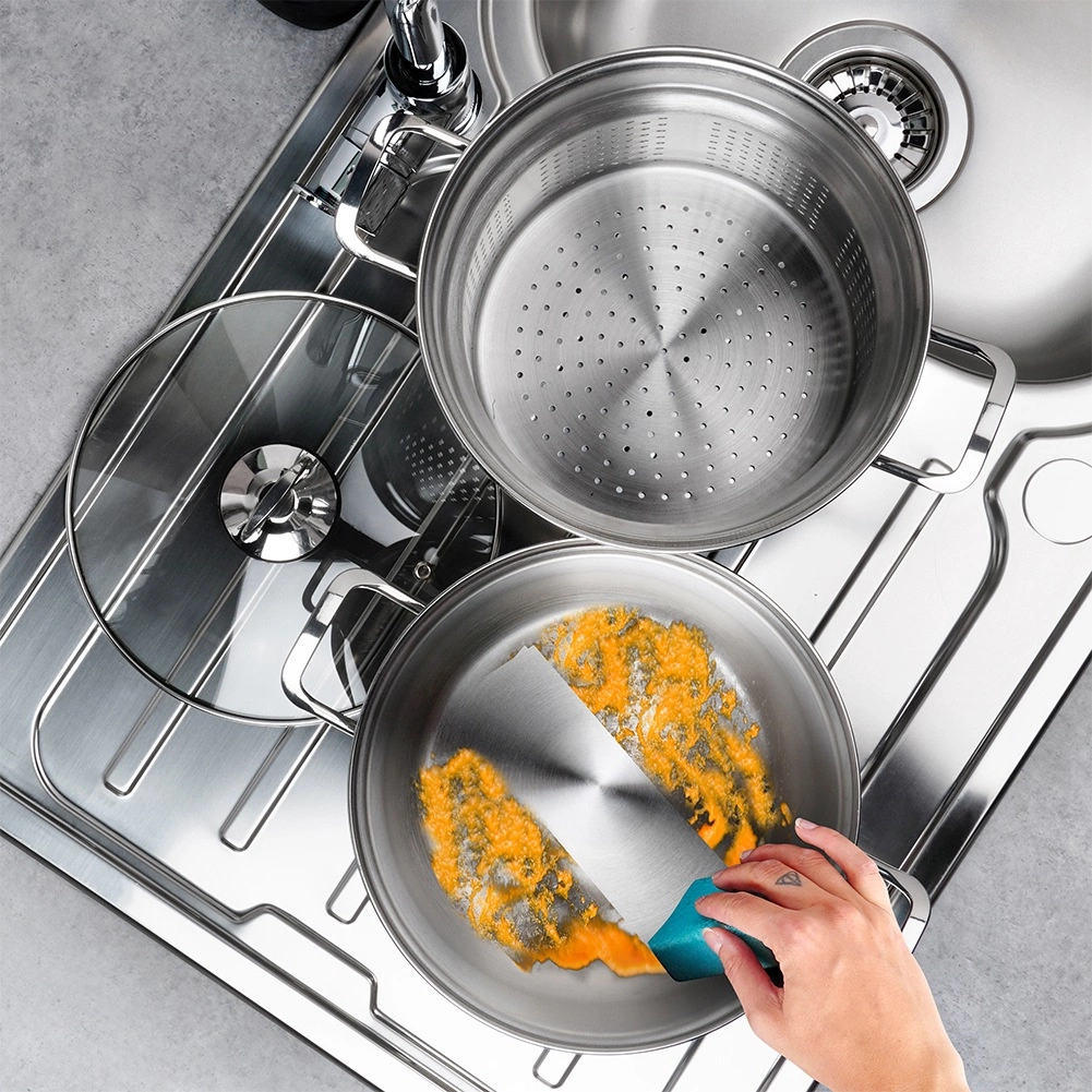 Leštená nerezová oceľ je hygienická a odolná proti korózii. Sadu možno umývať v umývačke a uši zaisťujú bezpečnú manipuláciu.
