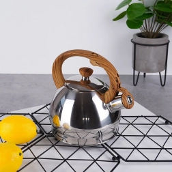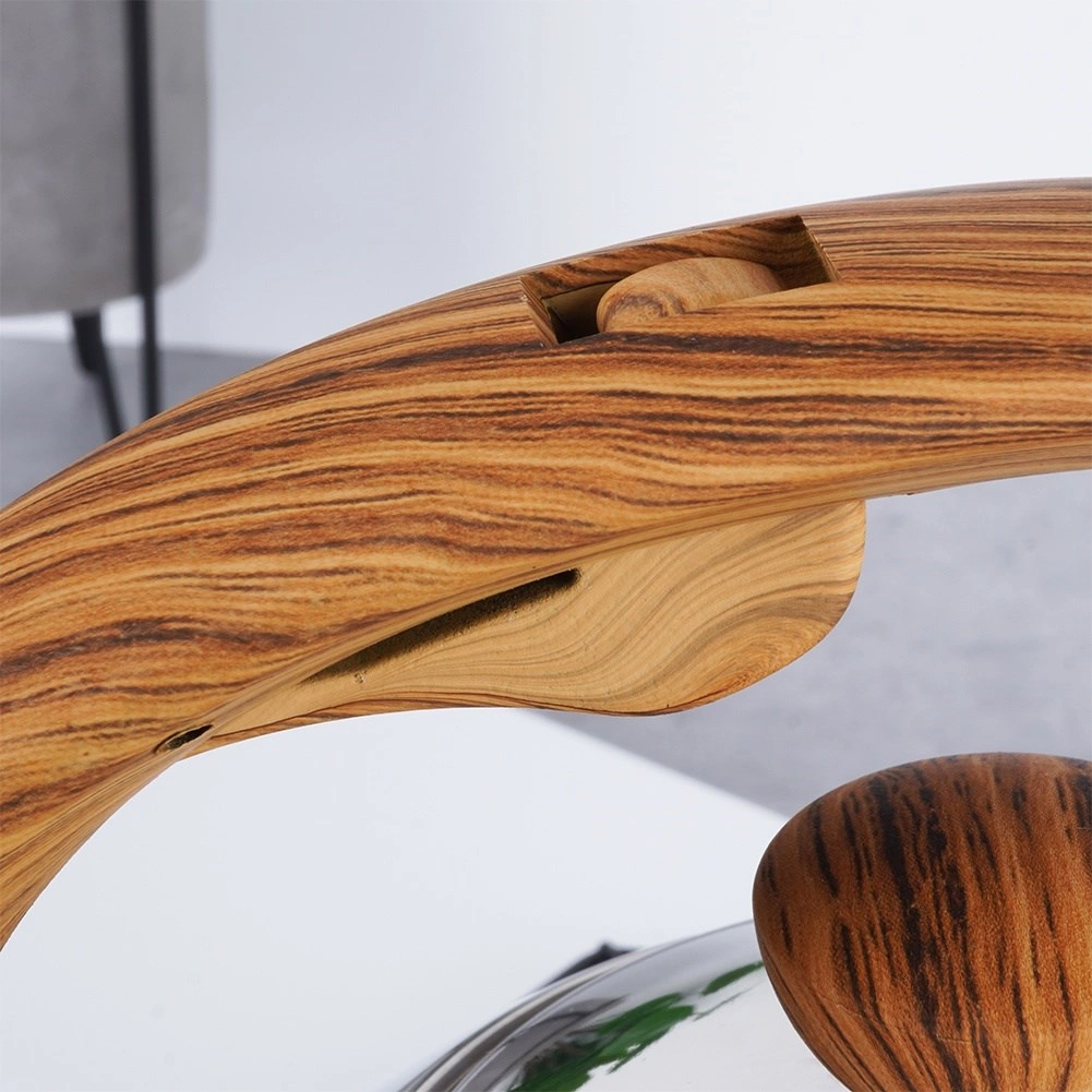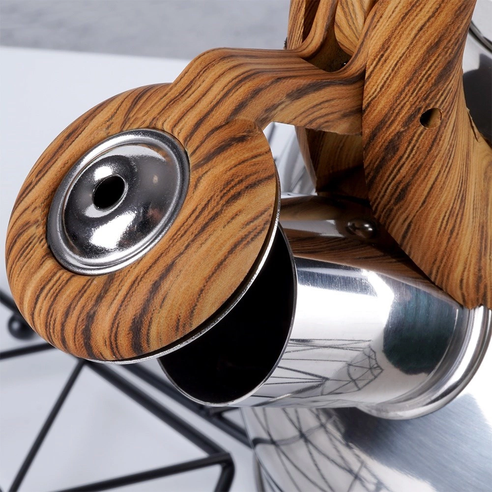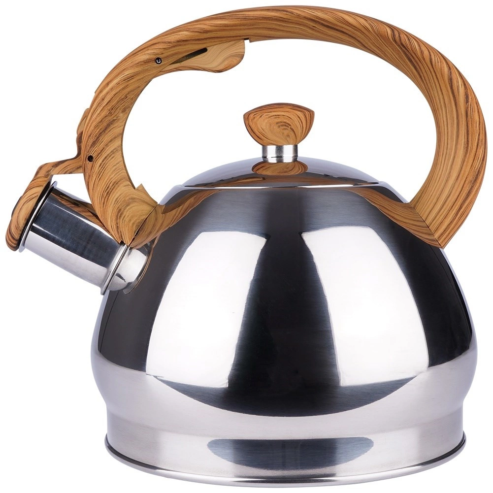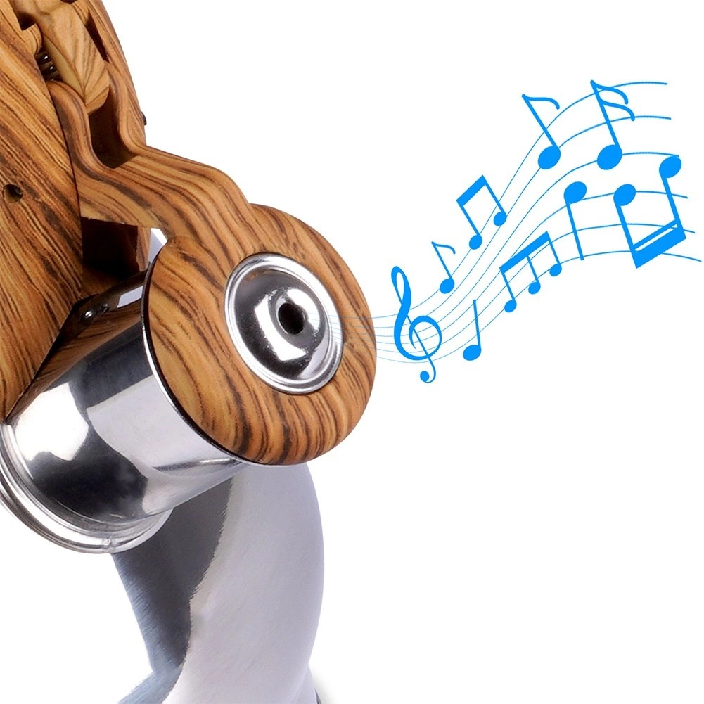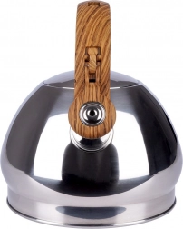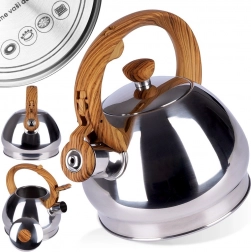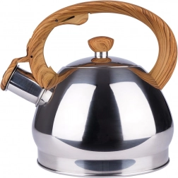 Štýlová nerezová kanvica s objemom 1,5 l a automatickým píšťalkovým viečkom na bezpečné upozornenie na var. Ergonomická tepelne odolná rukoväť s imitáciou dreva zabezpečí pohodlné nalievanie, široké dno pre rýchly ohrev a univerzálnu kompatibilitu vrátane indukcie. Ideálna na čaj, kávu aj bylinky.