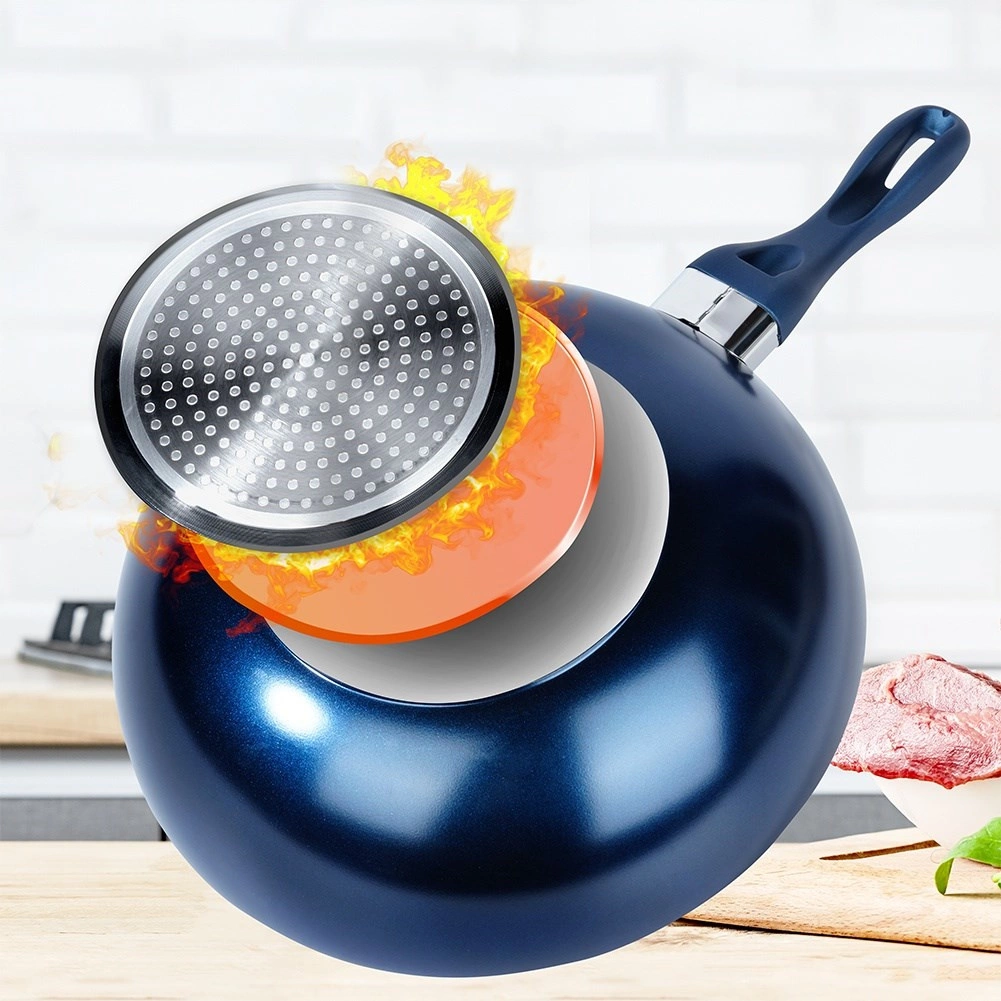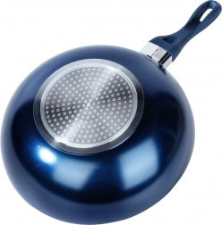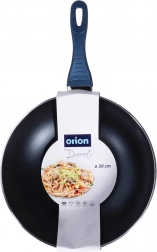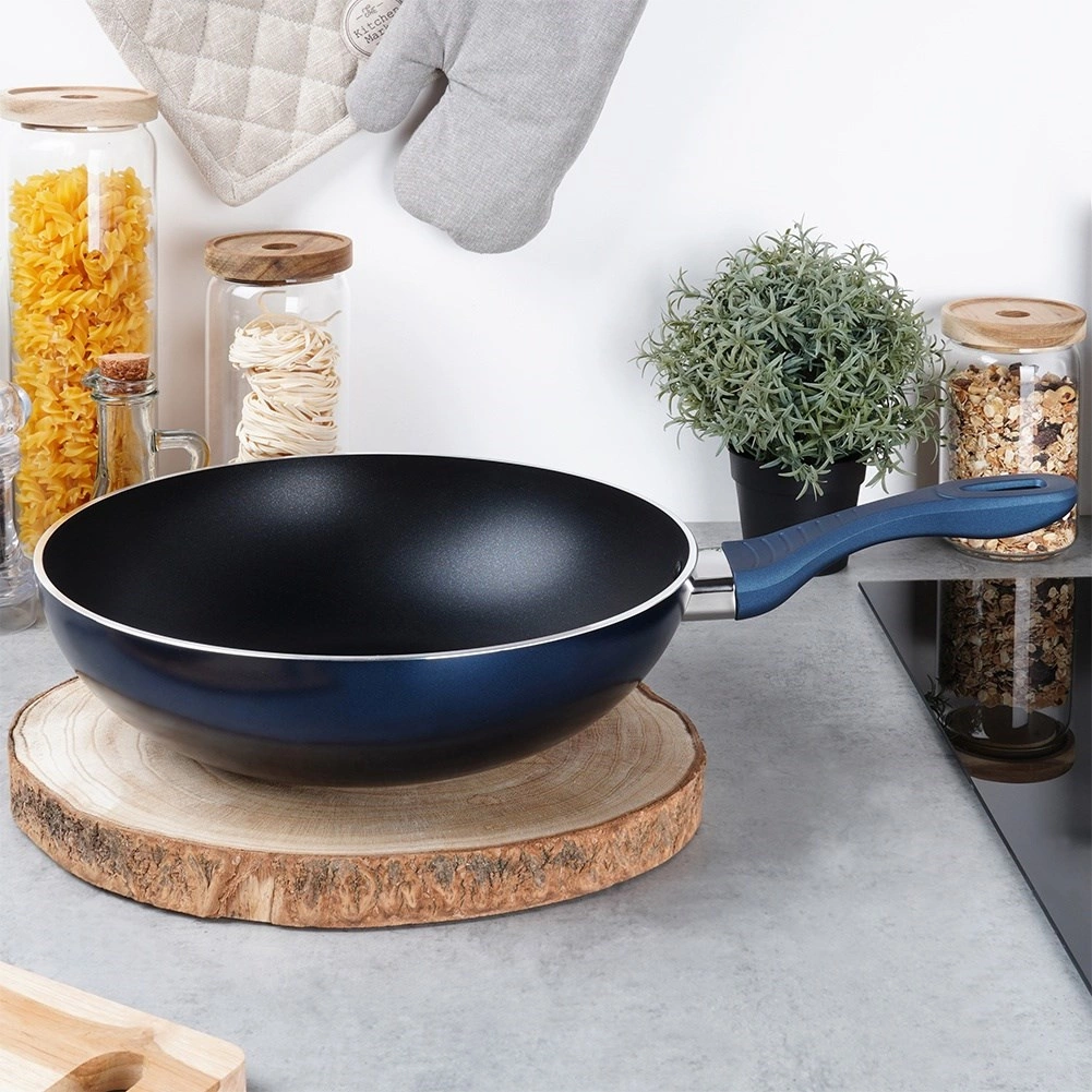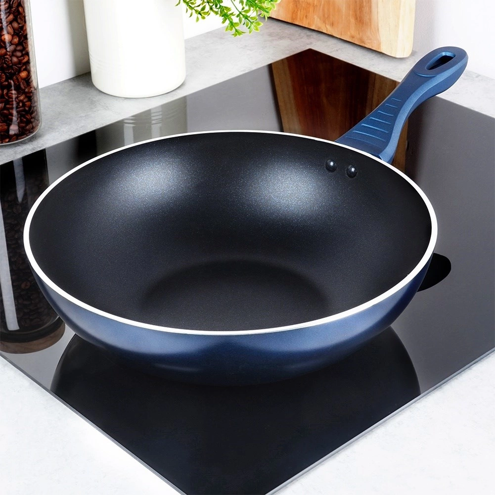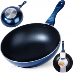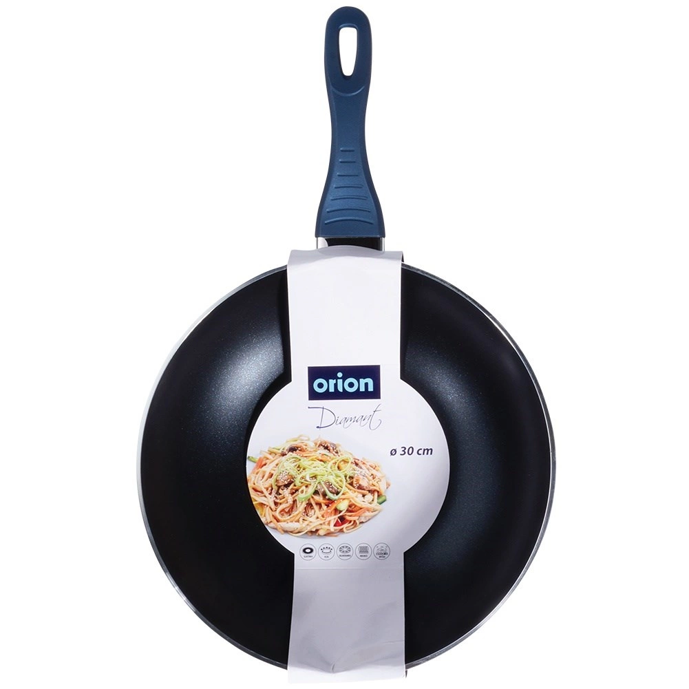 Univerzálna wok panvica s priemerom 30 cm s vysoko odolnou diamantovou nepriľnavou povrchovou úpravou na rýchle a rovnomerné varenie. Robustné hliníkové telo, indukčné dno a ergonomická, nezohrievajúca sa rukoväť v modrej farbe. Vhodná na všetky typy sporákov, ideálna na nízkotučné vyprážanie a restovanie, ľahko sa čistí a je vhodná do umývačky.