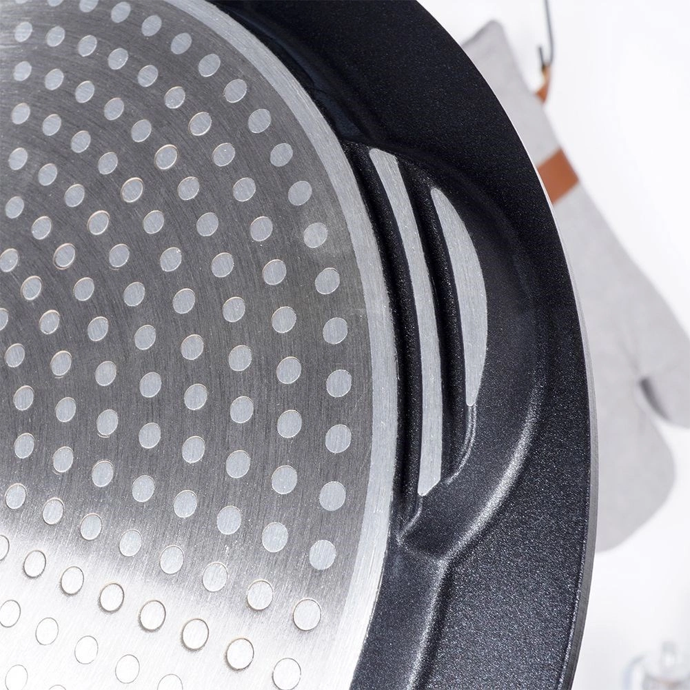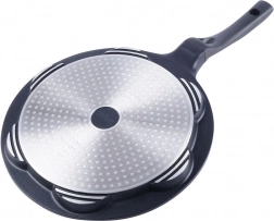 Hliníkové telo s výbornou vodivosťou prenáša teplo po celej ploche panvice, čo znamená úsporu času aj energie. Panvica je kompatibilná s plynom, elektrinou, sklokeramikou aj indukciou. Ergonomická rukoväť z odolného plastu sa nezahrieva pre bezpečnú manipuláciu.