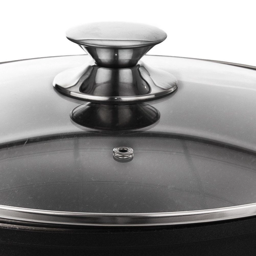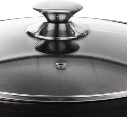 Tvrdené sklo s otvorom na paru a robustné úchyty pre istý úchop. Panvica má ergonomickú, nezohrievajúcu sa rukoväť.