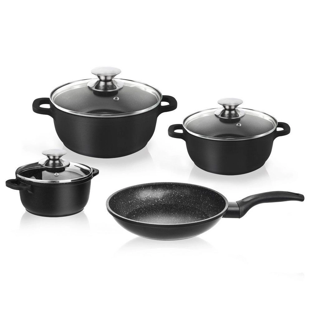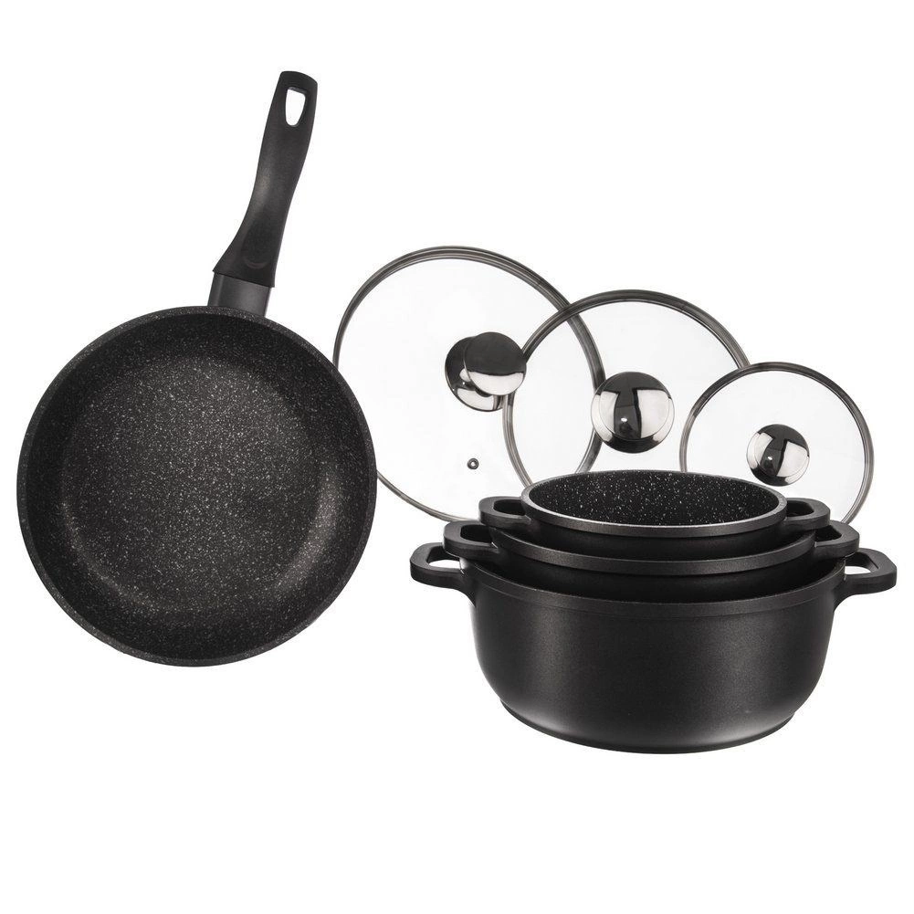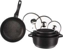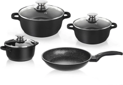 Sada GRANDE 7-dielna je ideálnou voľbou na varenie, dusenie aj vyprážanie. Tri veľkosti hrncov s tvrdenými sklenenými pokrievkami a všestranná panvica pokryjú väčšinu kuchynských úloh – od polievok a omáčok až po mäso, zeleninu či palacinky. Moderná granitová povrchová úprava PFLUON je odolná proti poškriabaniu, nepriľnavá a bez PFOA a PTFE, takže jedlo si zachová prirodzenú chuť aj živiny.