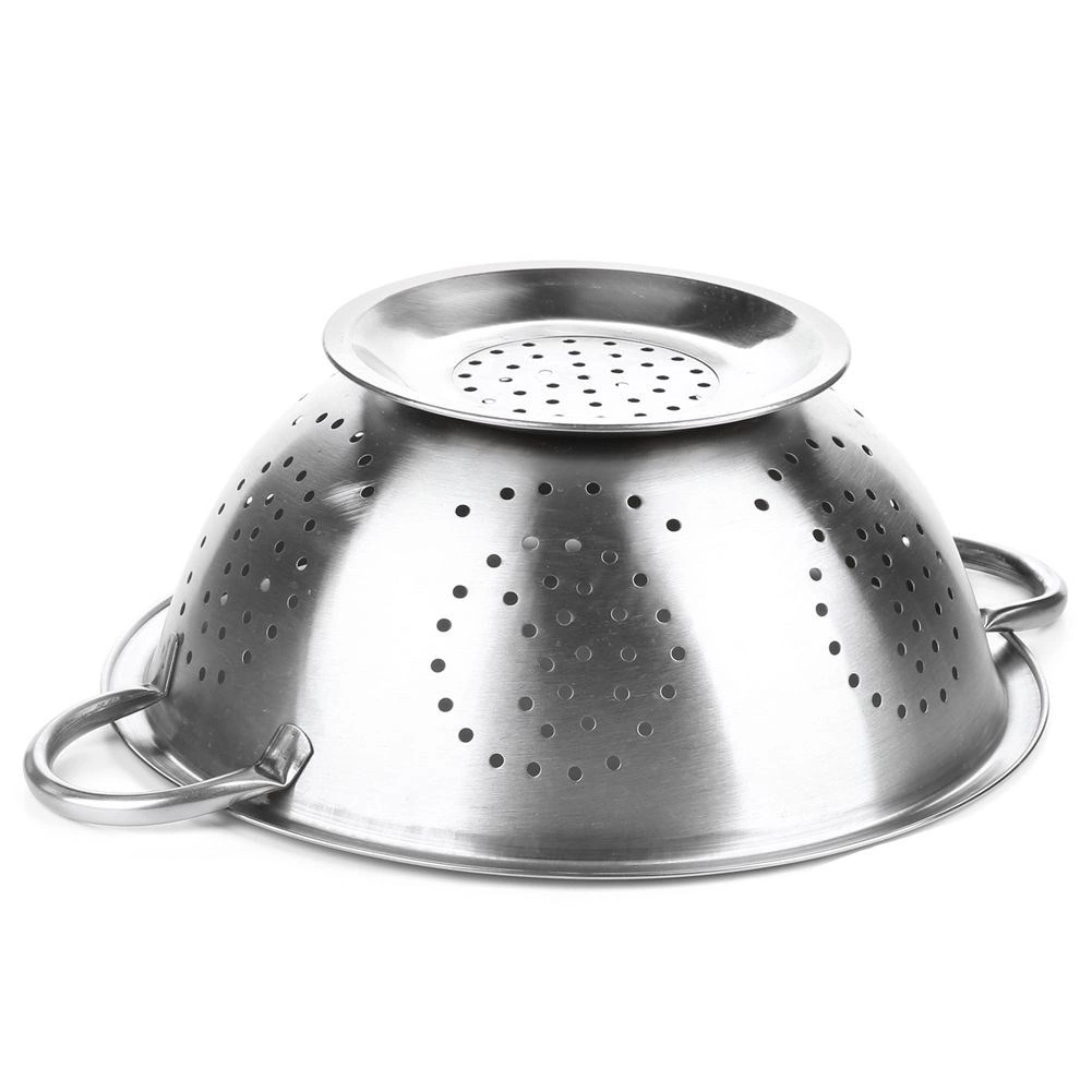 Univerzálny nerezový cedník s priemerom 28 cm s praktickými bočnými úchytmi a stabilným podstavcom na ľahké umývanie ovocia a zeleniny aj cedenie cestovín. Vyrobený z kvalitnej nehrdzavejúcej ocele, je odolný, bezpečný pre potraviny a vďaka mnohým perforáciám rýchlo odvádza vodu.