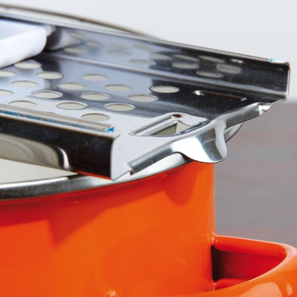 Uľahčite si varenie s robustným strúhadlom na noky z kvalitnej nerezovej ocele v kombinácii s odolným bielym plastom. Vďaka posuvnému nadstavcu cesto ľahko pretlačíte cez otvory s priemerom 8 mm priamo do hrnca. Doraz drží strúhadlo pevne na okraji, takže máte obe ruky pod kontrolou.