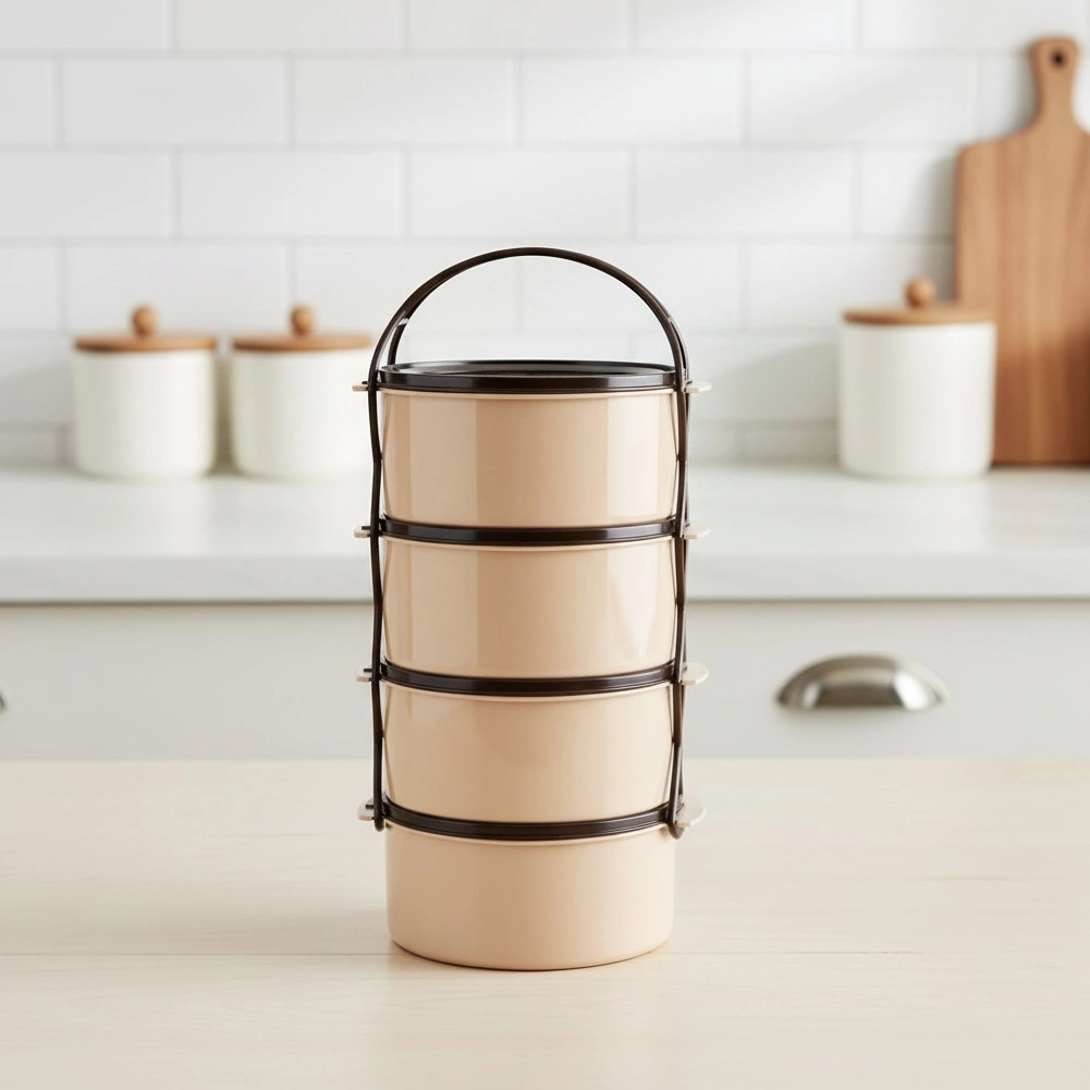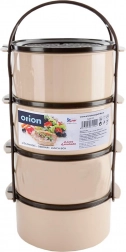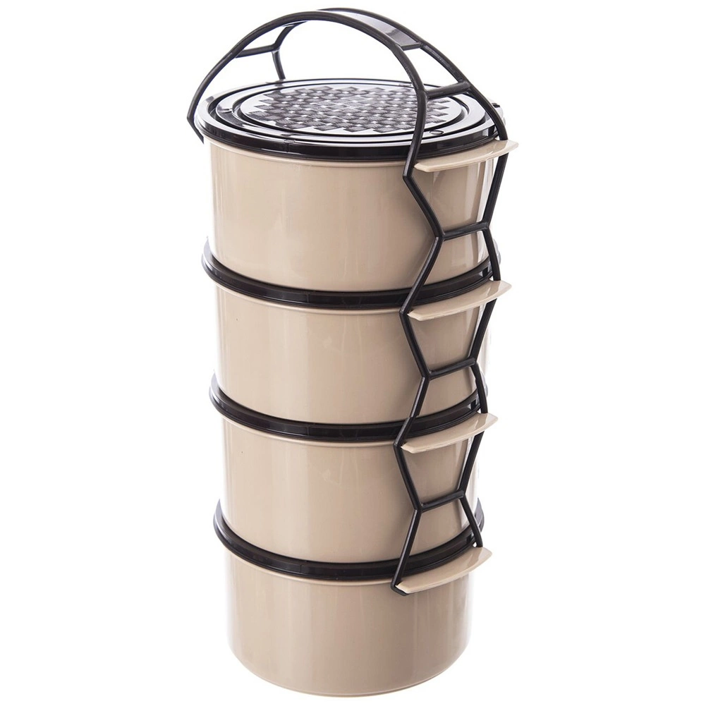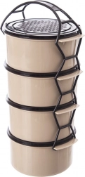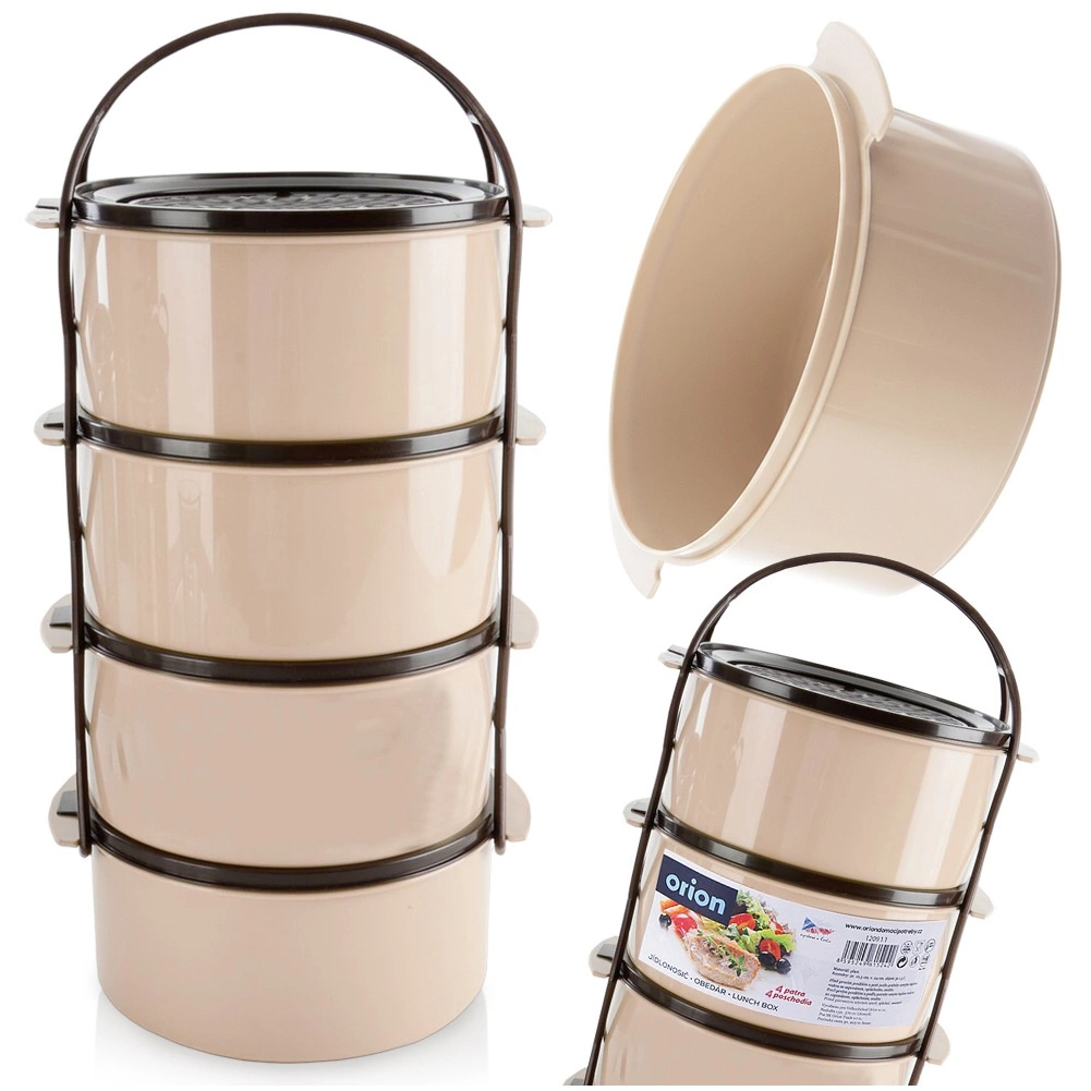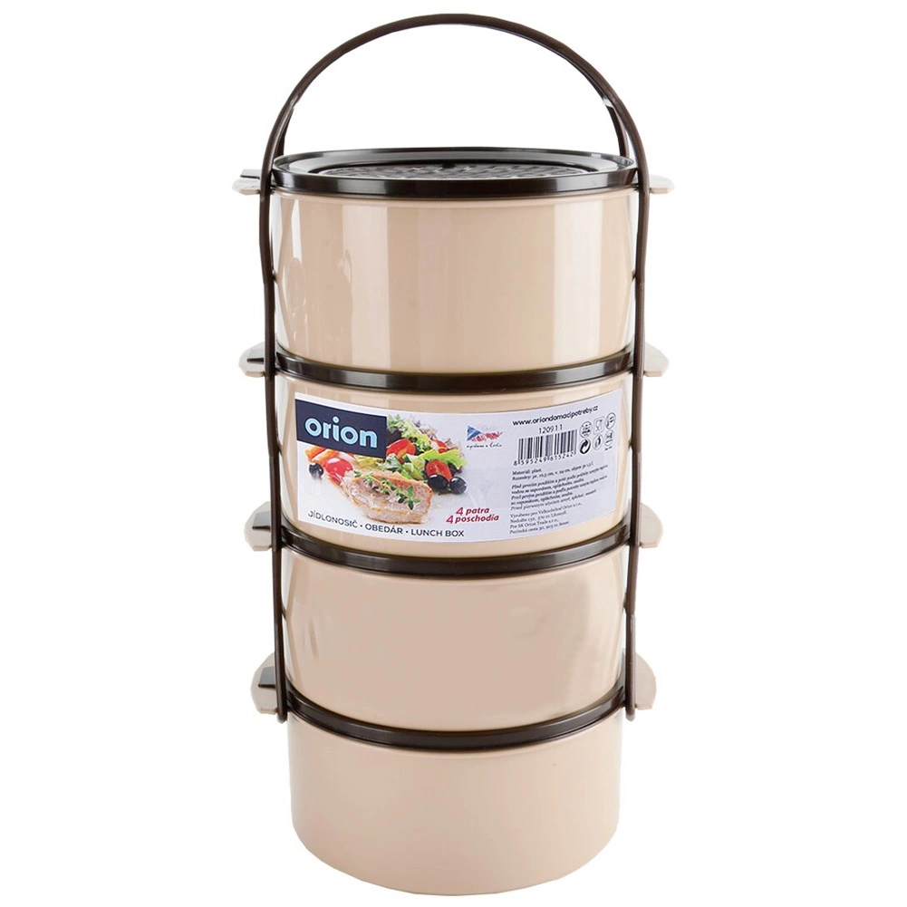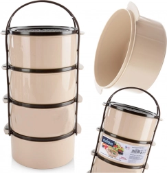 Praktická štvorposchodová menážka na jedlo s objemom 4×1,5 l na prehľadné oddelenie pokrmov. Má stohovateľné nádoby s viečkami, pevný nosný rám s držadlom a odolné prevedenie v béžovo‑hnedej farbe. Vhodná do umývačky, chladničky, mrazničky a do mikrovlnky bez viečok.