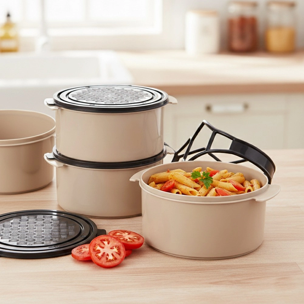 Veľkorysá kapacita na hlavný chod, prílohy aj dezert. Každá nádoba má vlastné viečko a uchováva jedlo oddelene a prehľadne.