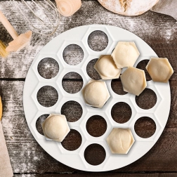 Praktická forma na pelmene, ravioli a mini pirohy s priemerom 24 cm na rýchlu prípravu až 37 kúskov naraz. Z ľahkého a odolného potravinárskeho plastu v bielej farbe, ideálna na rýchle a rovnomerné tvarovanie náplní aj cesta. Skvelá do každej kuchyne aj gastra, šetrí čas a zaručuje dokonalý tvar každého kúsku.