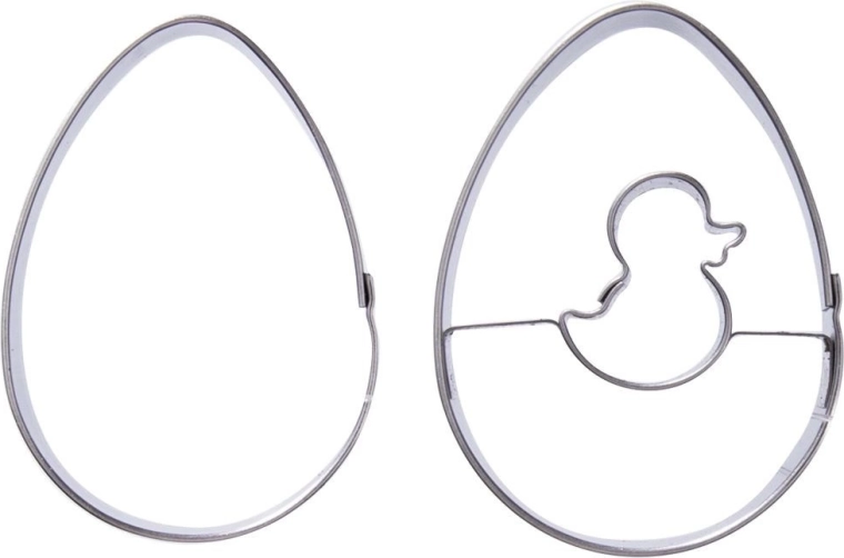 Praktická sada dvoch vykrajovačiek v tvare vajíčka z kvalitnej nehrdzavejúcej ocele na jednoduchú výrobu sušienok, perníčkov a fondánových ozdôb. Rozmer jednej vykrajovačky je 5,5 × 3,8 × 1,6 cm. Sú odolné, univerzálne a vhodné aj do umývačky riadu.