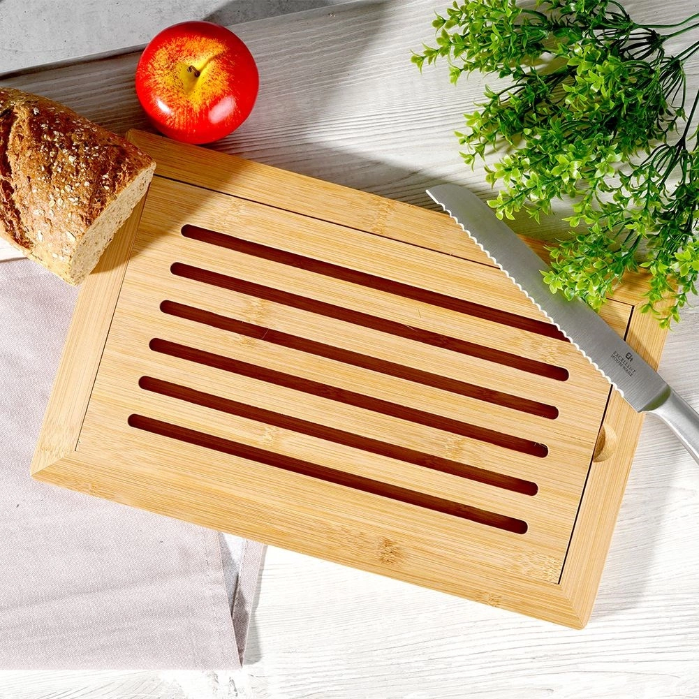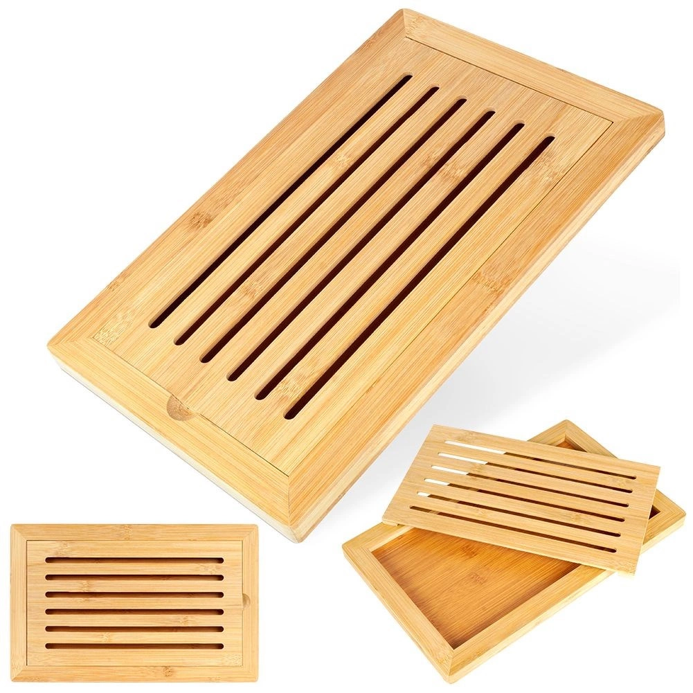 Elegantná doska na krájanie pečiva z prírodného bambusu prináša čistotu a poriadok do vašej kuchyne. Vyberateľná horná mriežka umožňuje, aby omrvinky prepádavali do spodného tácka, takže po narezaní bochníka stačí dosku vysypať a je upratané. Bambus je ľahké, pevné a voči vlhkosti odolné drevo, ktoré nepohlcuje pachy a rýchlo schne.