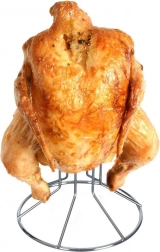 Praktický stojan na pečenie kurčaťa zabezpečí rovnomerné prepečenie a krásne chrumkavú kôrku. Vďaka vertikálnej polohe mäso neleží v tuku, takže je zdravšie, šťavnaté vo vnútri a chrumkavé zvonka. Robustná konštrukcia z pochrómovaného drôtu a stabilná základňa uľahčujú bezpečné používanie v každej kuchyni.