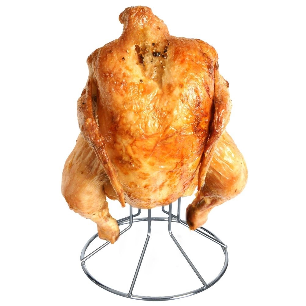 Stojan je vyrobený z kvalitného chrómovaného kovového drôtu, má stabilnú základňu a ľahko sa používa aj skladuje. Je univerzálny – hodí sa nielen na kurča, ale aj na kačicu, morku alebo hus, čo z neho robí praktický doplnok do každej domácnosti.