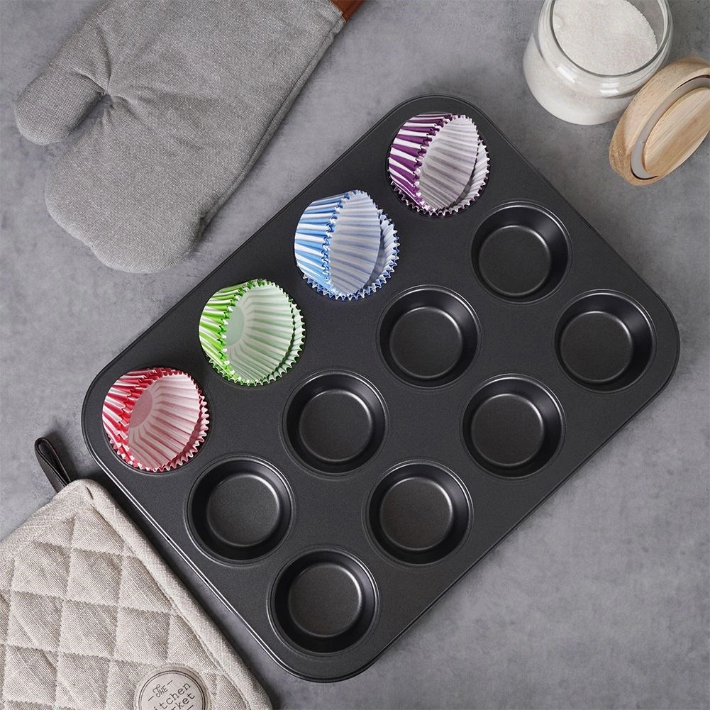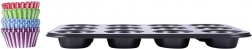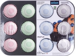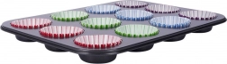 Táto kvalitná forma na muffiny s rozmermi 35 × 27 × 3 cm má 12 rovnomerne rozmiestnených jamiek s horným priemerom 6,5 cm. Odolný kov s nepriľnavou povrchovou úpravou zaistí ľahké vyklopenie aj pri použití minimálneho množstva tuku. Súčasťou balenia je 72 kusov papierových košíčkov v rôznych farbách pre čisté pečenie a atraktívnu prezentáciu.