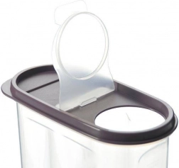 Veko s výklopným výsypným otvorom umožní nasypať presné množstvo múky, cukru či cereálií bez skladania celého veka.